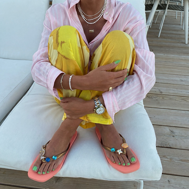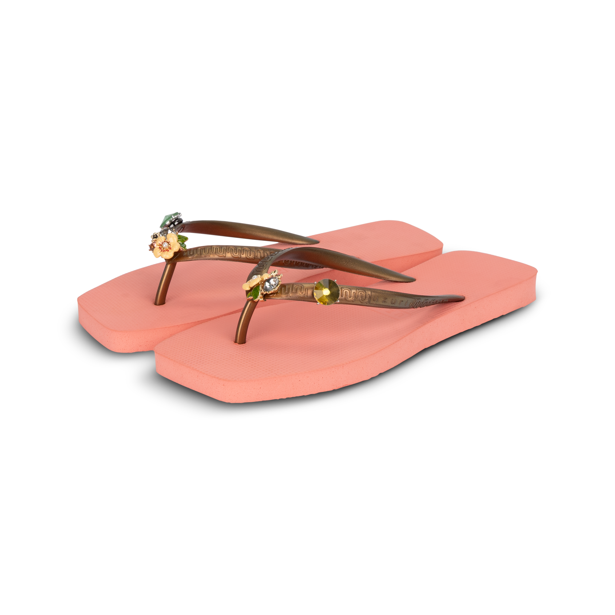 Der Flore Square strahlt pure Sommereleganz mit einer verspielten, femininen Note aus. Dieser handgefertigte Slipper verfügt über eine Sohle in sanften Farbtönen und ist mit raffinierten Riemchen verziert, die mit floralen Details, funkelnden Steinen und dezenten Farbakzenten versehen sind. Die Kombination aus sanften Tönen und glänzenden Elementen verleiht dem Slipper einen frischen und luxuriösen Look. Dank seiner bequemen und dennoch robusten Sohle ist der Flore Square ideal für lang anhaltenden Tragekomfort, während die dekorativen Blumen und Steine einen stilvollen Blickfang an Ihren Füßen bilden. Perfekt für sonnige Tage, eine Stadtterrasse oder einen eleganten Strandlook.