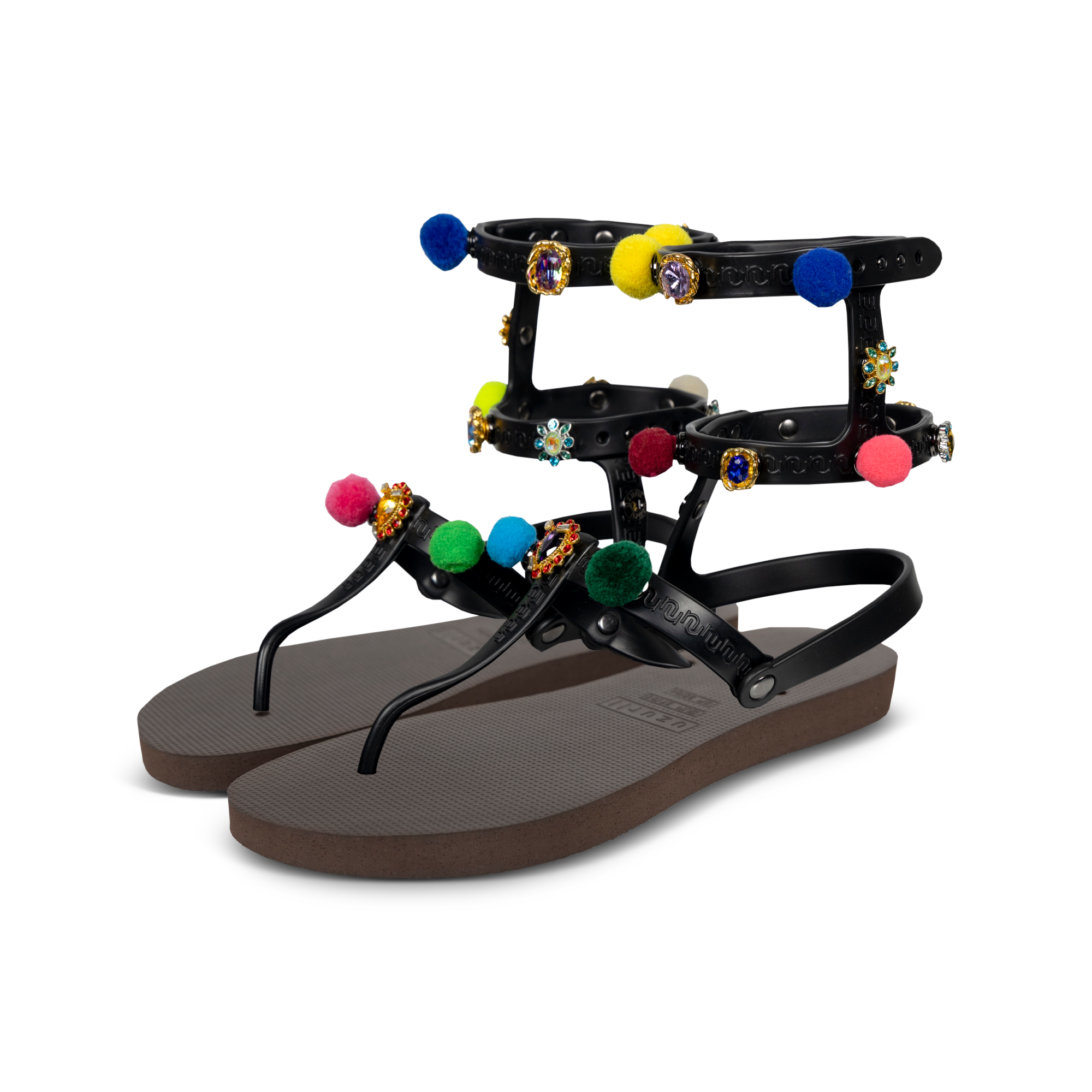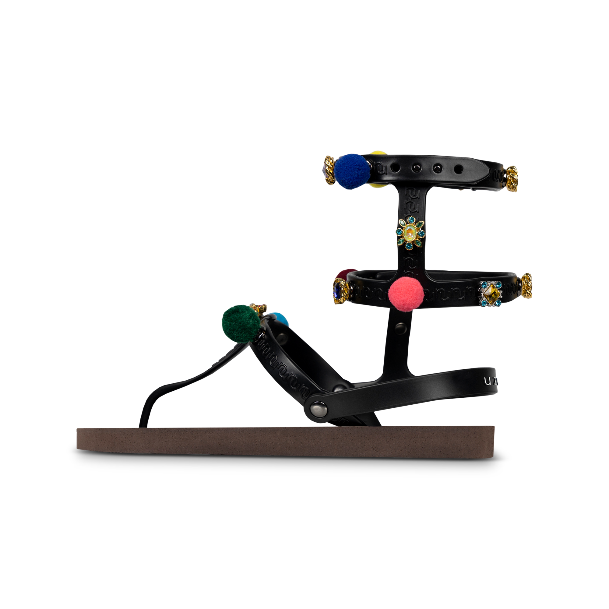 Stell dir vor, du bist auf Ibiza mit unseren Mystique Pompom! Diese Sandalen erkennst du an den Pompons und bunten Steinen. Dank der Druckknöpfe kannst du die Pompons und Steine selbst wechseln. Wähle aus einer großen Auswahl von Steinen aus unserer Accessoire-Linie. Gib deinen Schlappen im Handumdrehen einen neuen Look. Auf der Suche nach Komfort? Der Mystique Pompom bietet durch die Riemen über der Ferse zusätzlichen Halt. Unsere Schlappen sind einzigartig, handgefertigt und mit Sorgfalt und Liebe entworfen. Die Sohle, die sich seidenweich an deinem Fuß anfühlt, besteht aus Gummi. Die Riemen sind aus PVC. Das V zeichnet sich durch das originale Uzurii-Logo an den Riemen aus. Unsere Schlappen werden in China und Brasilien hergestellt.