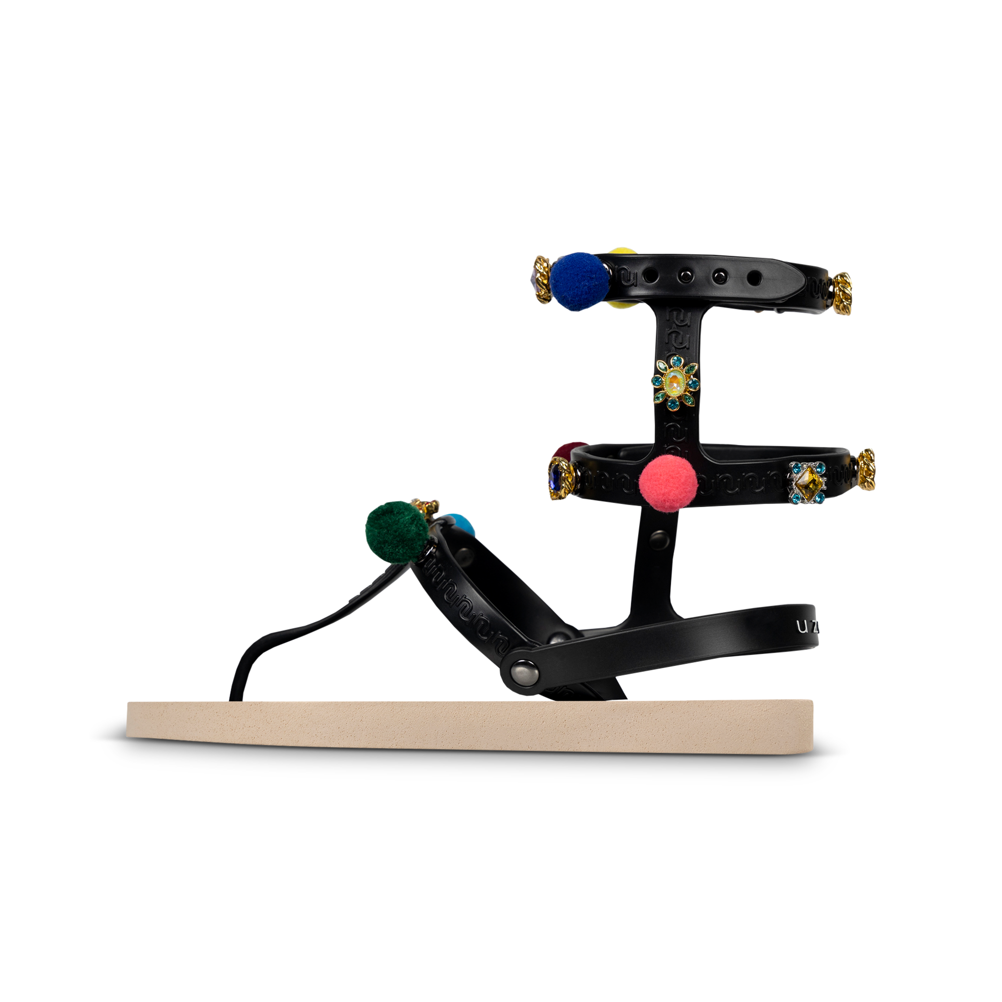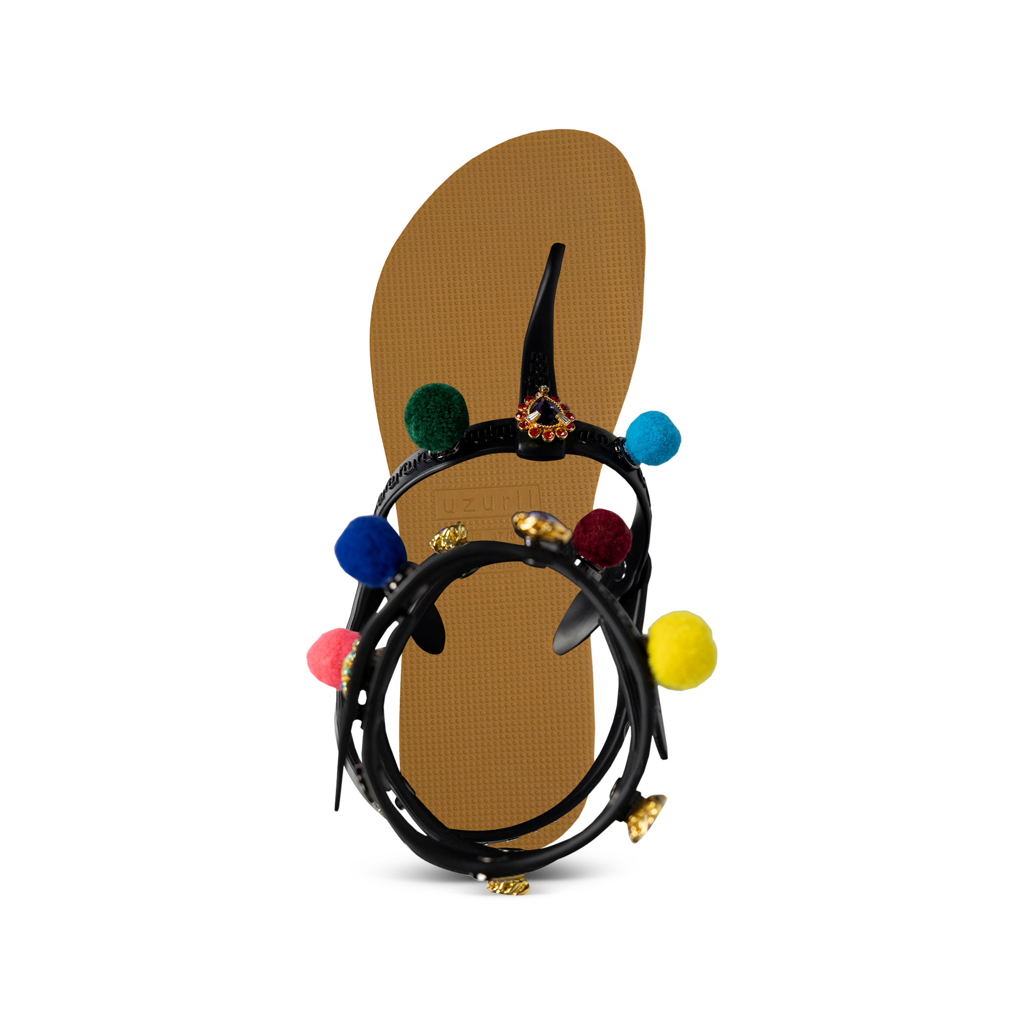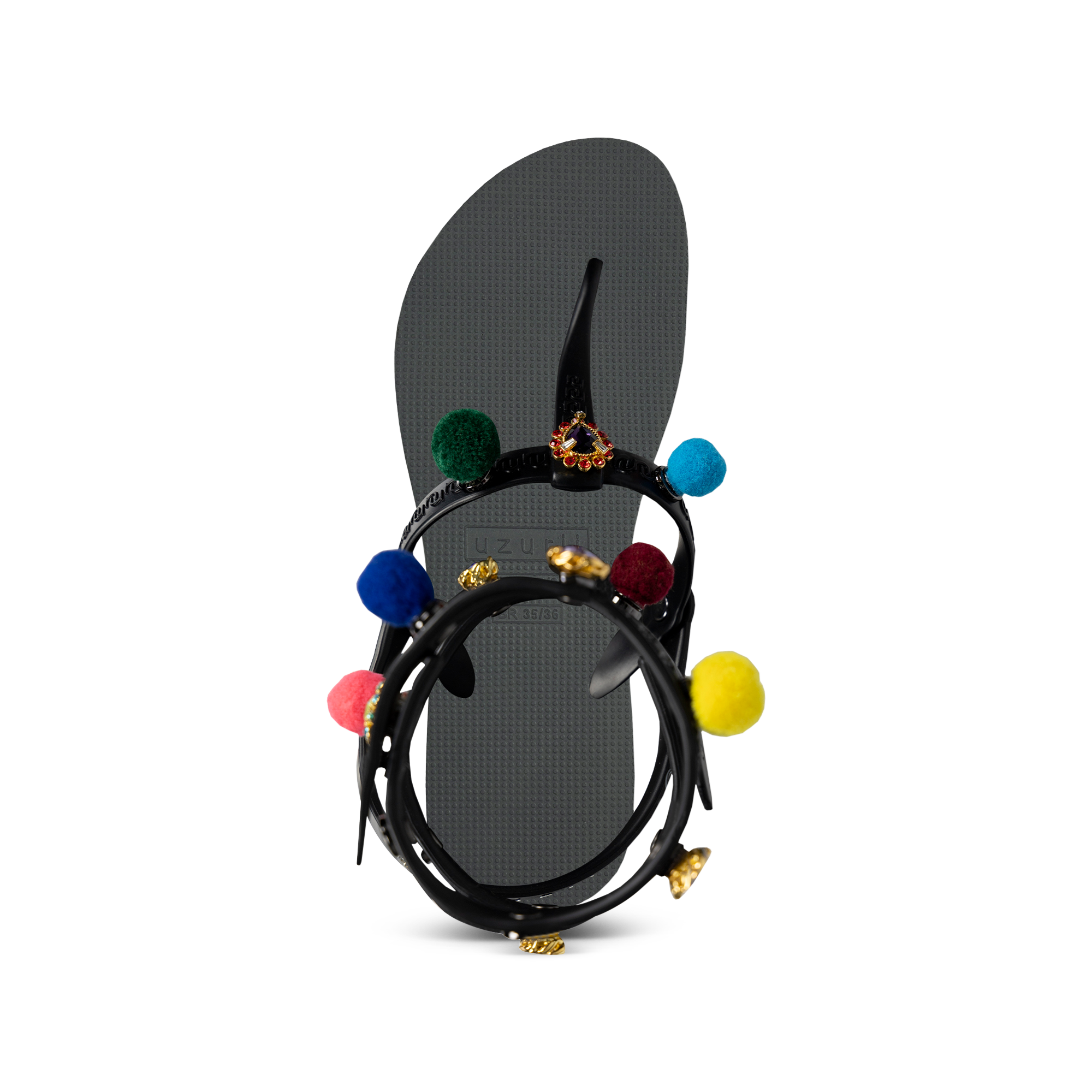 Stell dir vor, du bist auf Ibiza mit unseren Mystique Pompom! Diese Sandalen erkennst du an den Pompons und bunten Steinen. Dank der Druckknöpfe kannst du die Pompons und Steine selbst wechseln. Wähle aus einer großen Auswahl von Steinen aus unserer Accessoire-Linie. Gib deinen Schlappen im Handumdrehen einen neuen Look. Auf der Suche nach Komfort? Der Mystique Pompom bietet durch die Riemen über der Ferse zusätzlichen Halt. Unsere Schlappen sind einzigartig, handgefertigt und mit Sorgfalt und Liebe entworfen. Die Sohle, die sich seidenweich an deinem Fuß anfühlt, besteht aus Gummi. Die Riemen sind aus PVC. Das V zeichnet sich durch das originale Uzurii-Logo an den Riemen aus. Unsere Schlappen werden in China und Brasilien hergestellt.