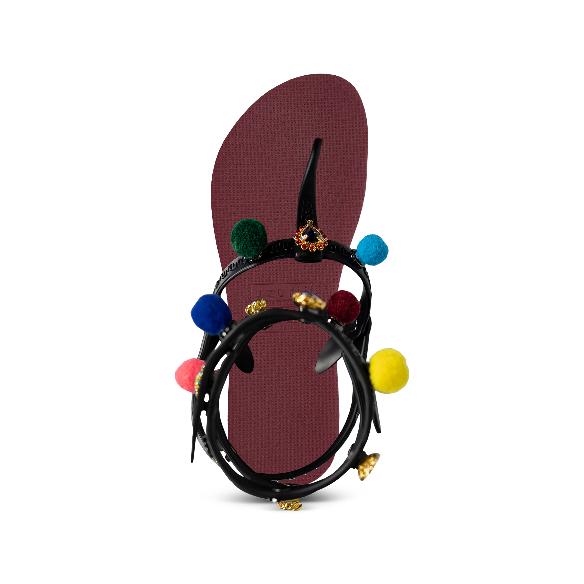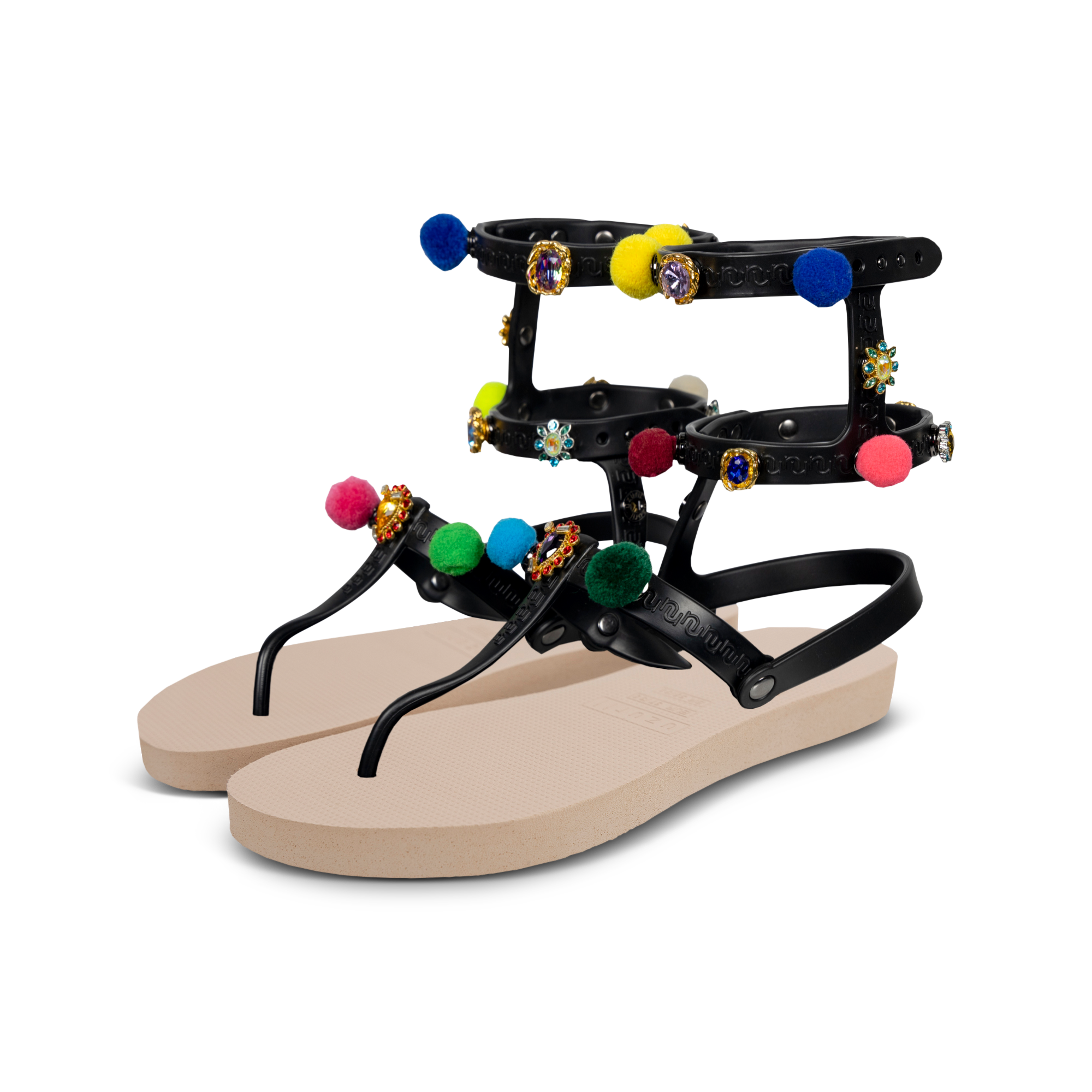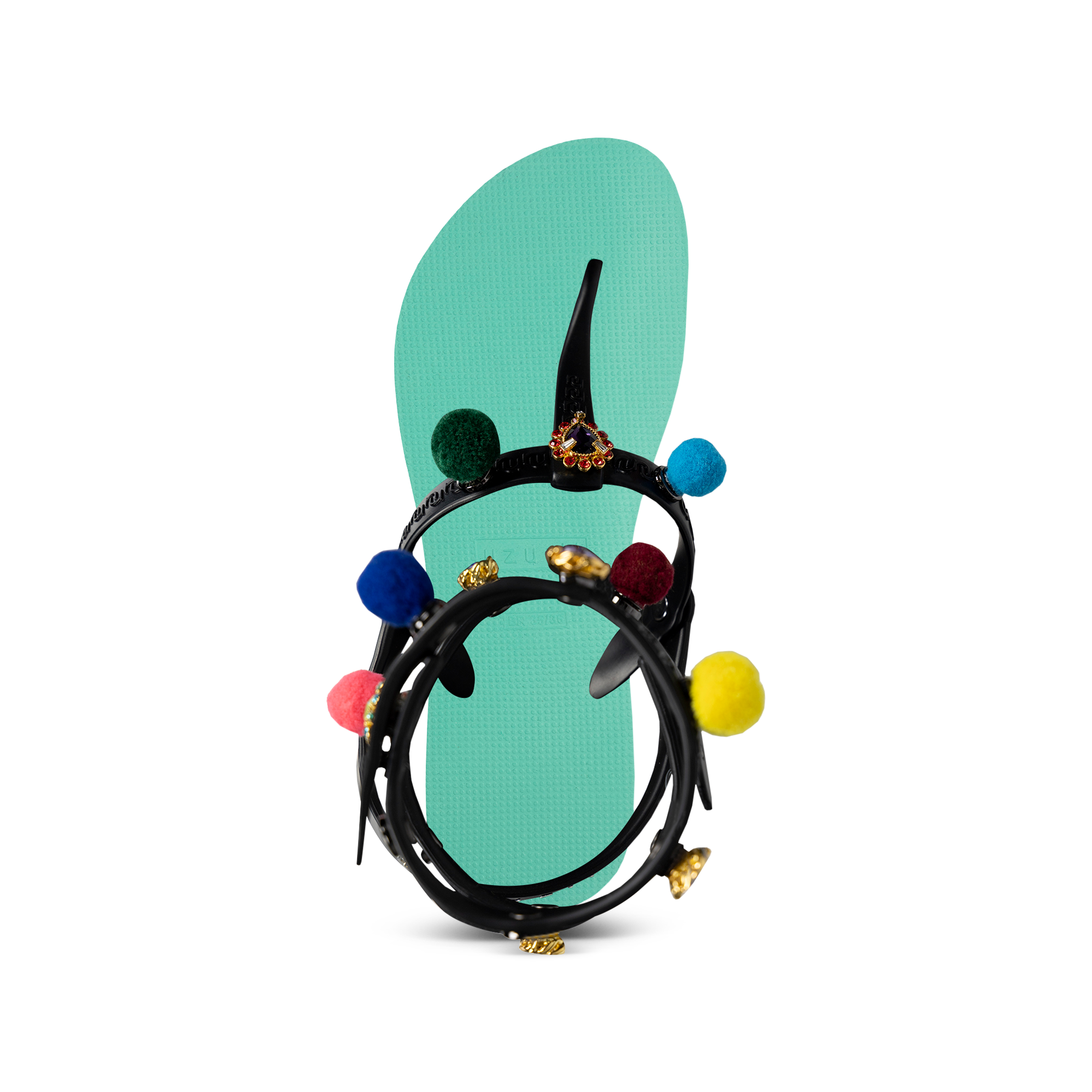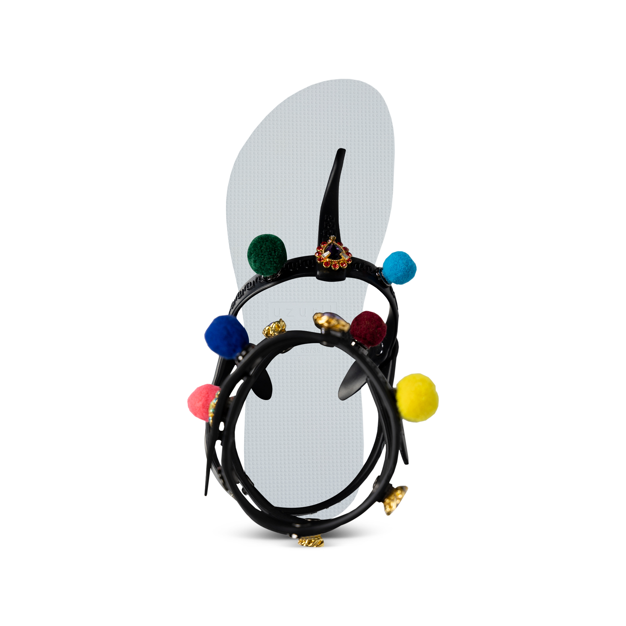 Stell dir vor, du bist auf Ibiza mit unseren Mystique Pompom! Diese Sandalen erkennst du an den Pompons und bunten Steinen. Dank der Druckknöpfe kannst du die Pompons und Steine selbst wechseln. Wähle aus einer großen Auswahl von Steinen aus unserer Accessoire-Linie. Gib deinen Schlappen im Handumdrehen einen neuen Look. Auf der Suche nach Komfort? Der Mystique Pompom bietet durch die Riemen über der Ferse zusätzlichen Halt. Unsere Schlappen sind einzigartig, handgefertigt und mit Sorgfalt und Liebe entworfen. Die Sohle, die sich seidenweich an deinem Fuß anfühlt, besteht aus Gummi. Die Riemen sind aus PVC. Das V zeichnet sich durch das originale Uzurii-Logo an den Riemen aus. Unsere Schlappen werden in China und Brasilien hergestellt.