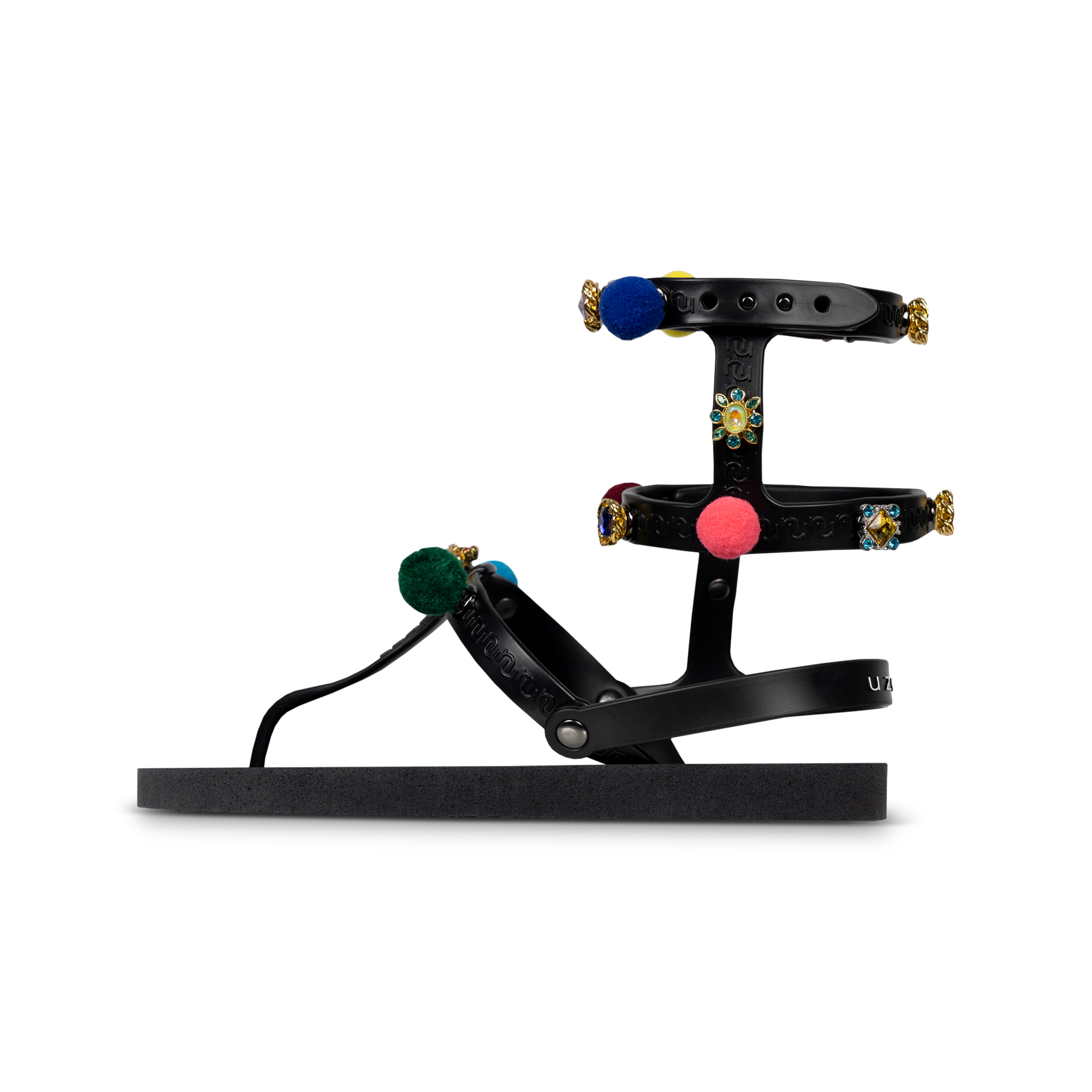 Stell dir vor, du bist auf Ibiza mit unseren Mystique Pompom! Diese Sandalen erkennst du an den Pompons und bunten Steinen. Dank der Druckknöpfe kannst du die Pompons und Steine selbst wechseln. Wähle aus einer großen Auswahl von Steinen aus unserer Accessoire-Linie. Gib deinen Schlappen im Handumdrehen einen neuen Look. Auf der Suche nach Komfort? Der Mystique Pompom bietet durch die Riemen über der Ferse zusätzlichen Halt. Unsere Schlappen sind einzigartig, handgefertigt und mit Sorgfalt und Liebe entworfen. Die Sohle, die sich seidenweich an deinem Fuß anfühlt, besteht aus Gummi. Die Riemen sind aus PVC. Das V zeichnet sich durch das originale Uzurii-Logo an den Riemen aus. Unsere Schlappen werden in China und Brasilien hergestellt.