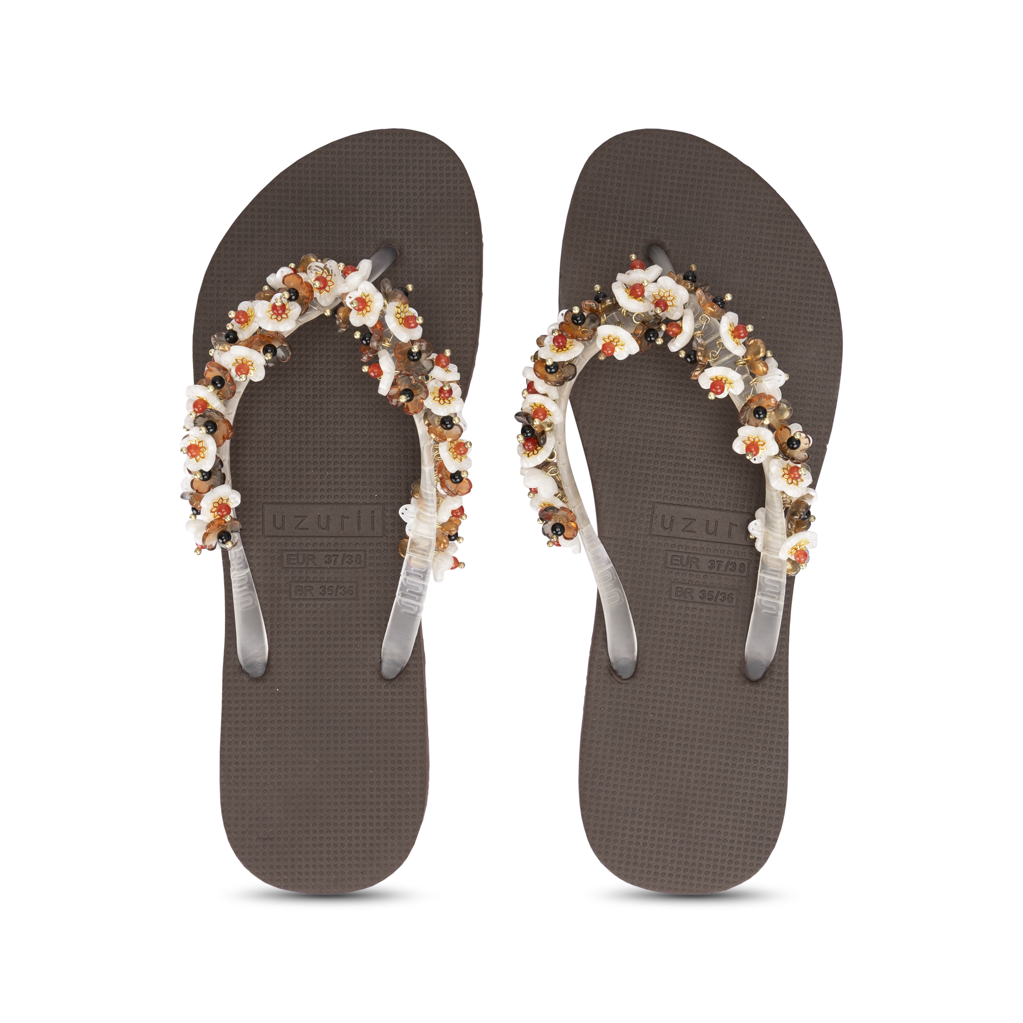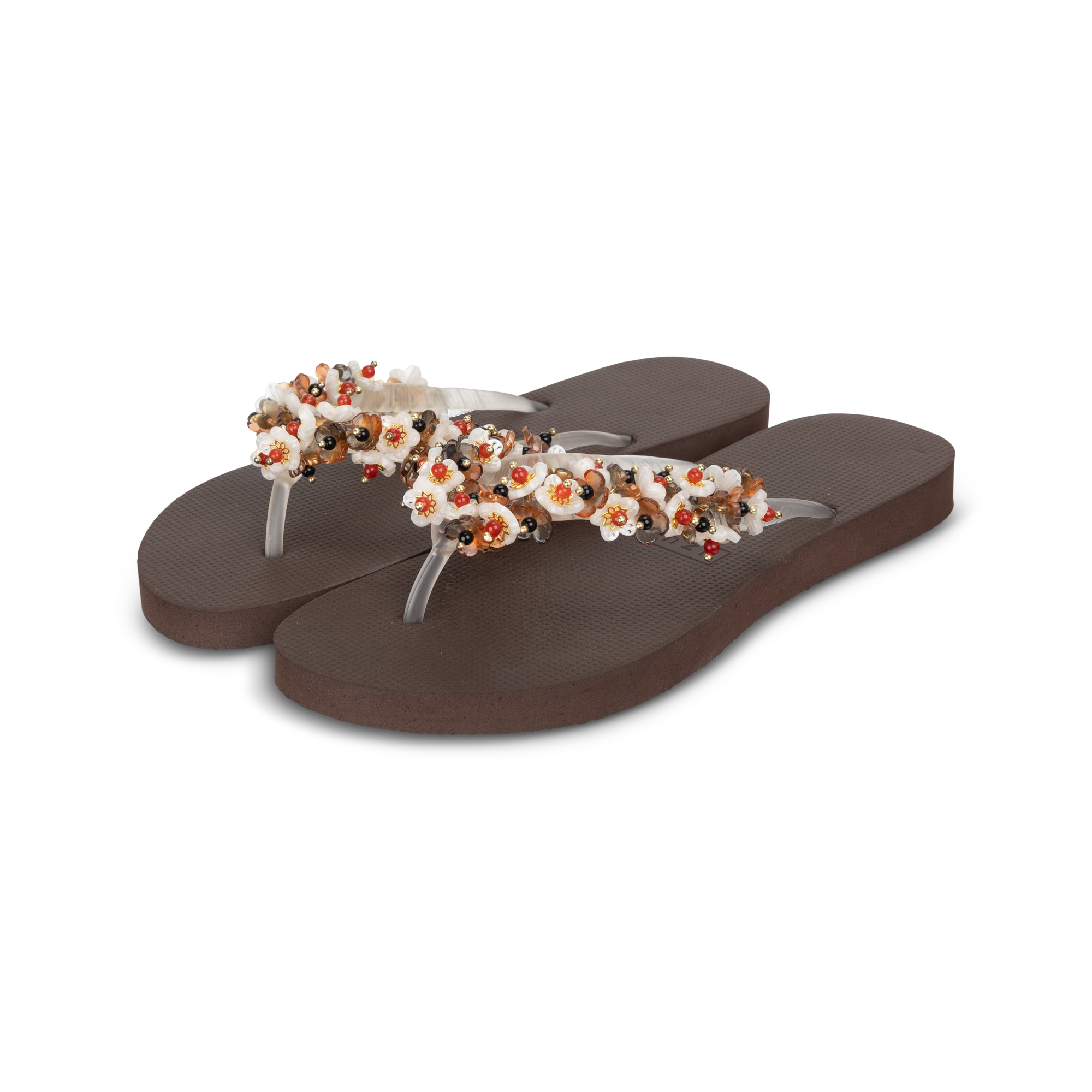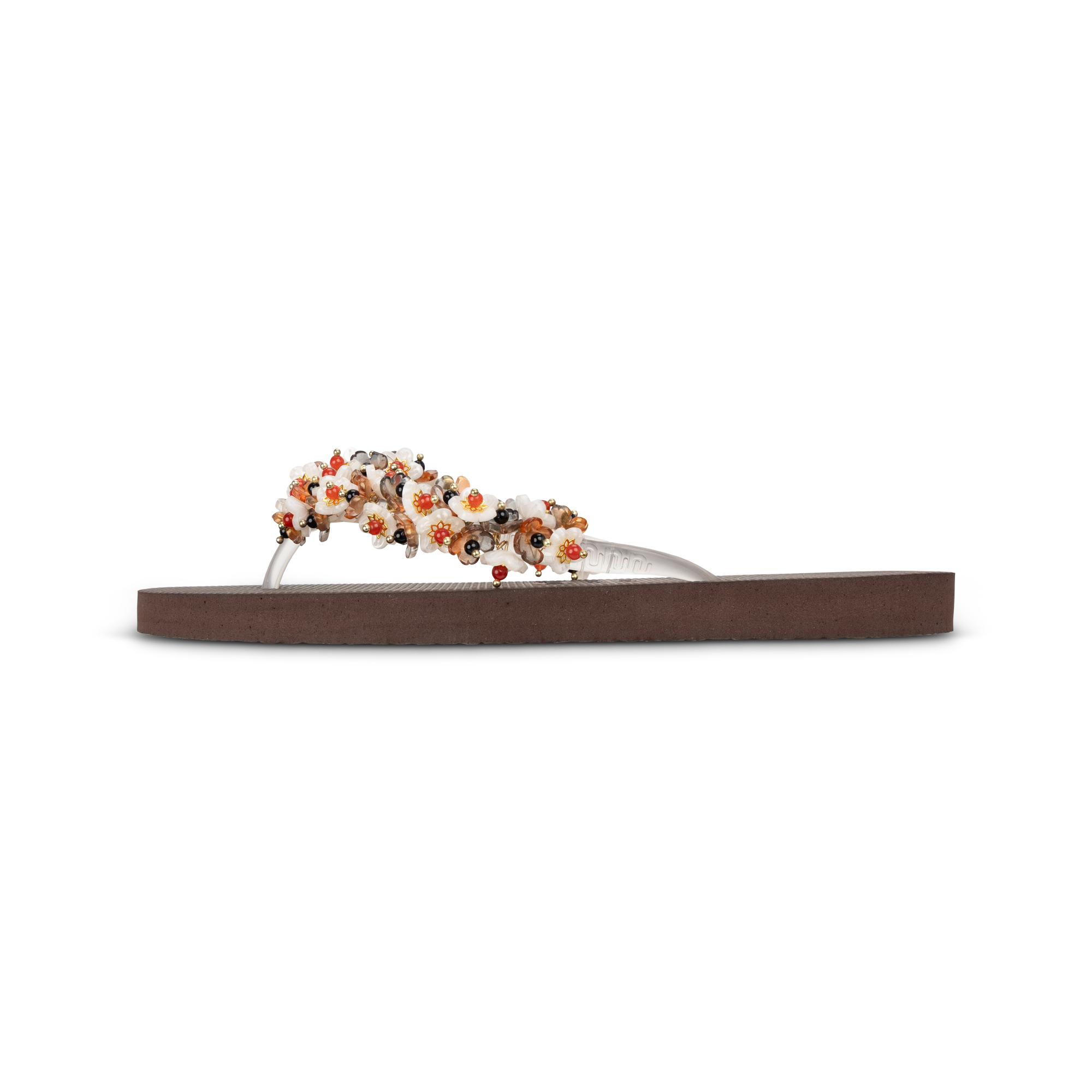Die Tulum Bloom ist eine Hommage an sommerliche Eleganz mit einem natürlichen Twist. Diese handgefertigte Sandale kombiniert eine hochwertige Sohle mit reich verzierten Riemen, geschmückt mit Blumen, Perlen und dezenten Glanzdetails. Jedes Detail wird von Hand angebracht, wodurch jedes Paar ein Unikat ist. Die weiche, zugleich stabile Sohle bietet optimalen Komfort, während die dekorativen Blumen für eine feminine und luxuriöse Ausstrahlung sorgen. Perfekt für einen sommerlichen Spaziergang, ein Beach-Club-Lunch oder einen stilvollen City-Look.