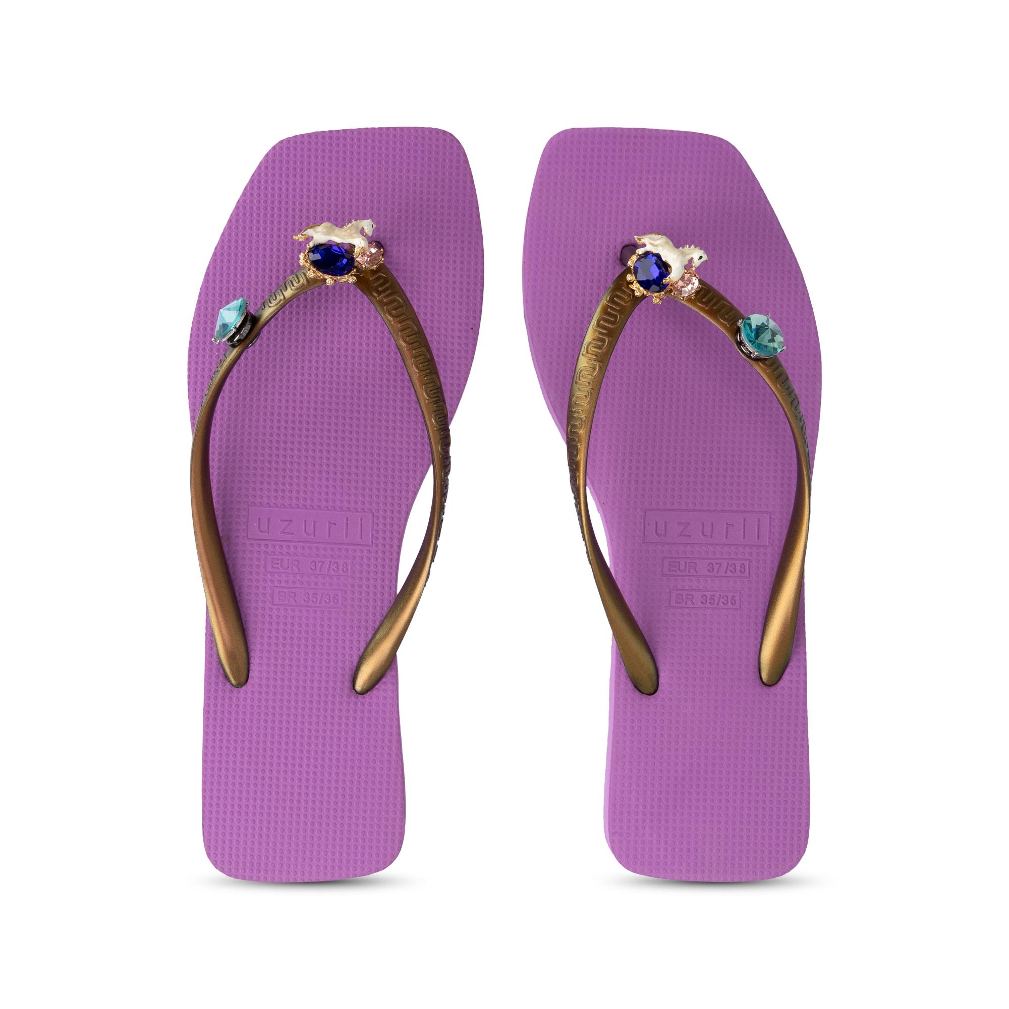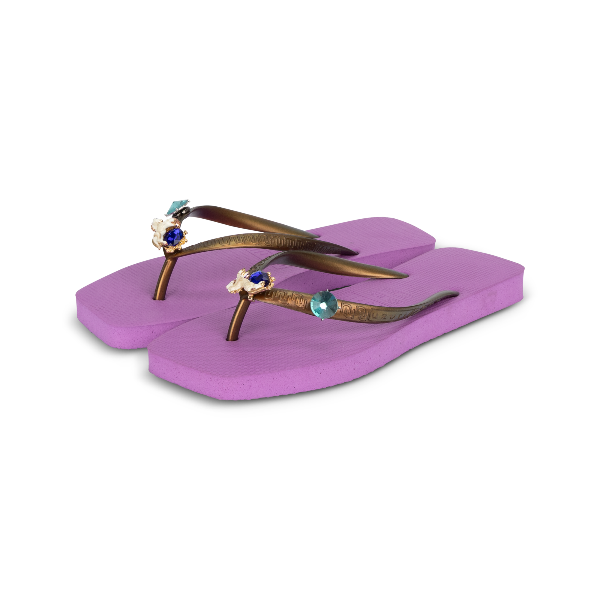 The Flore Square radiates pure summer elegance with a playful, feminine touch. This handmade slipper features a softly colored sole and is enriched with refined straps, finished with floral details, sparkling stones, and subtle color accents. The combination of soft tones and glossy elements gives the slipper a fresh and luxurious look. Thanks to its comfortable yet sturdy sole, the Flore Square is ideal for long-lasting comfort, while the decorative flowers and stones create a stylish eye-catcher at your feet. Perfect for sunny days, a city terrace, or an elegant beach look.