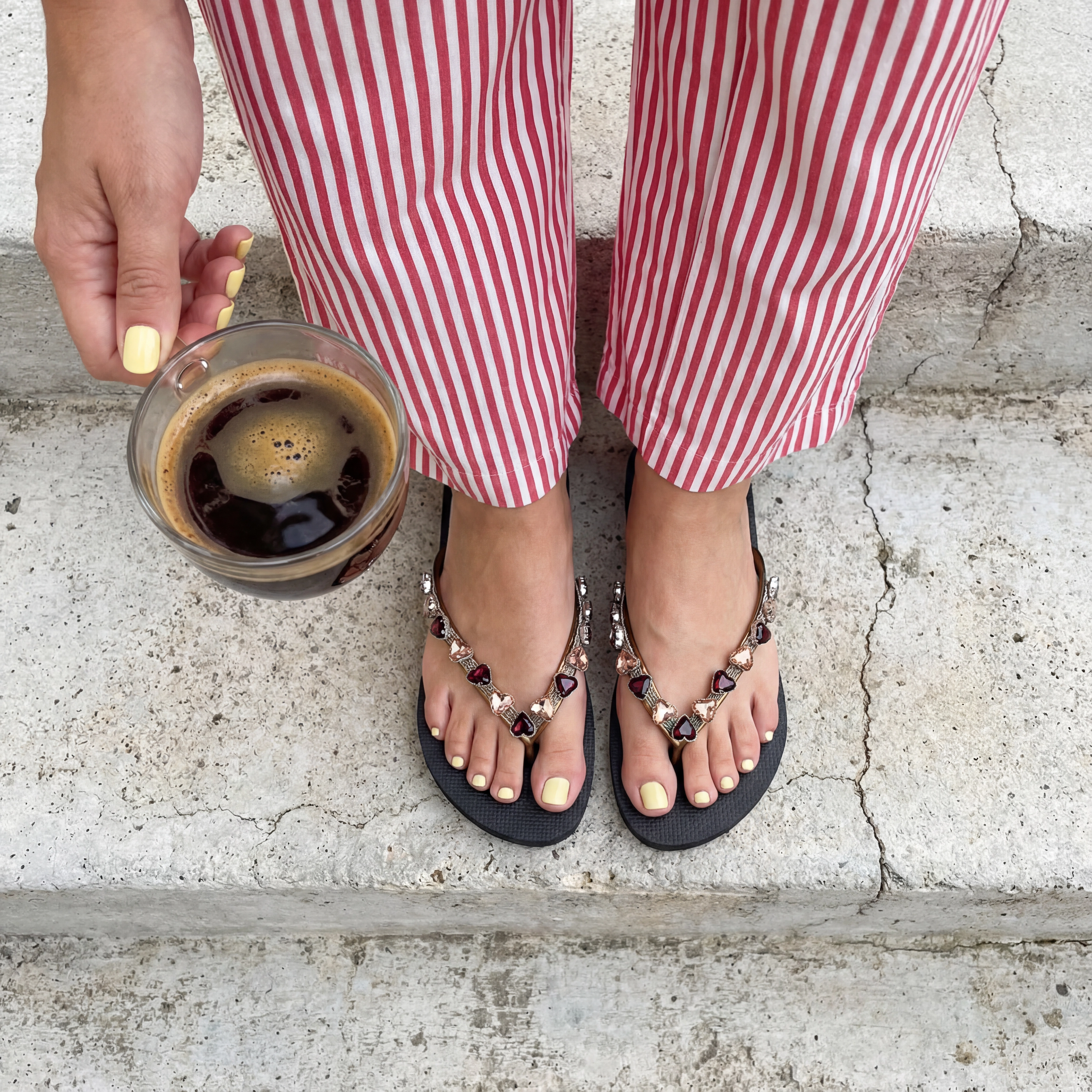 Ah, l'amour! These cute, bronze hearts give a cute look to the Heart Bronze flip-flops. The gold chain that runs over the V is a cool counterpart to the dark red and bronze-colored gemstones. The straps are decorated with the original Uzurii logo. Our slippers are unique, handmade and designed with attention. The sole, which feels silky soft on your foot, is made of rubber. The straps are made of PVC. The V is characterized by the original Uzurii logo on the straps. Our slippers are made in China and Brazil