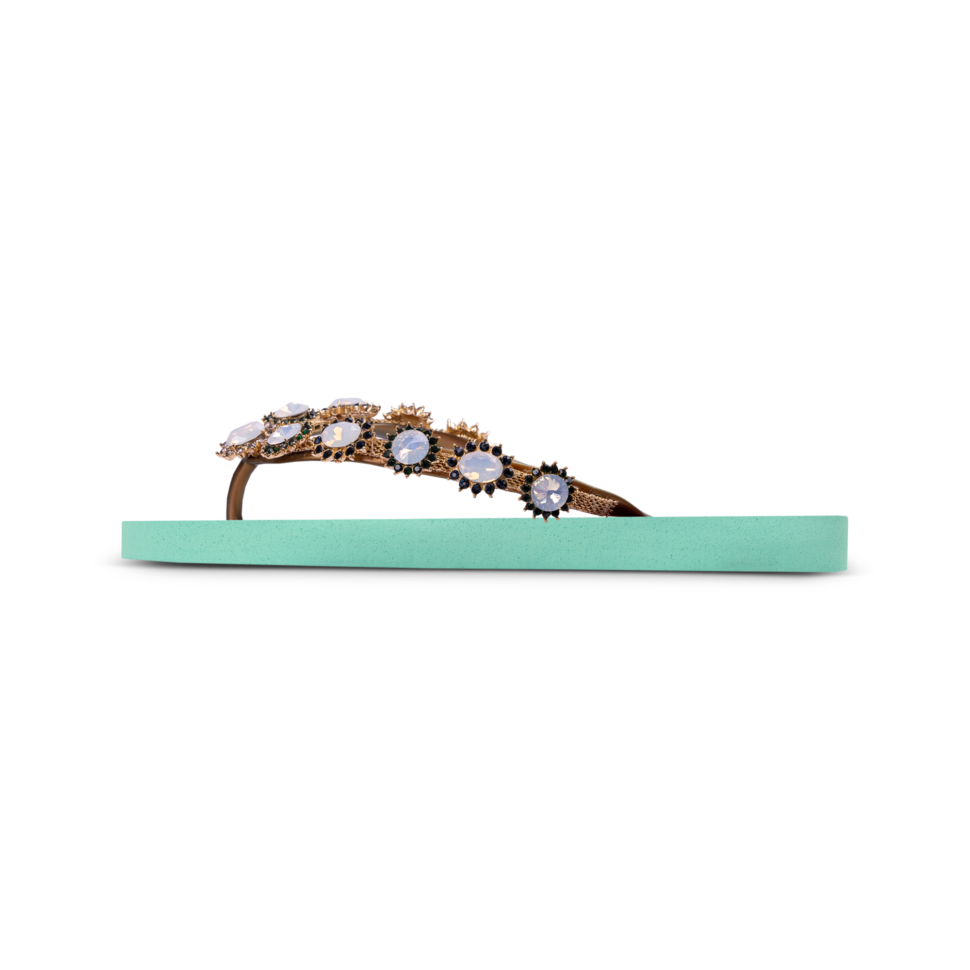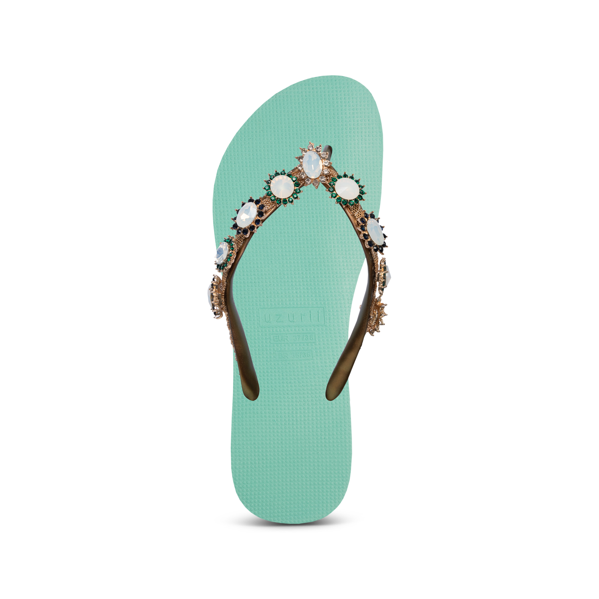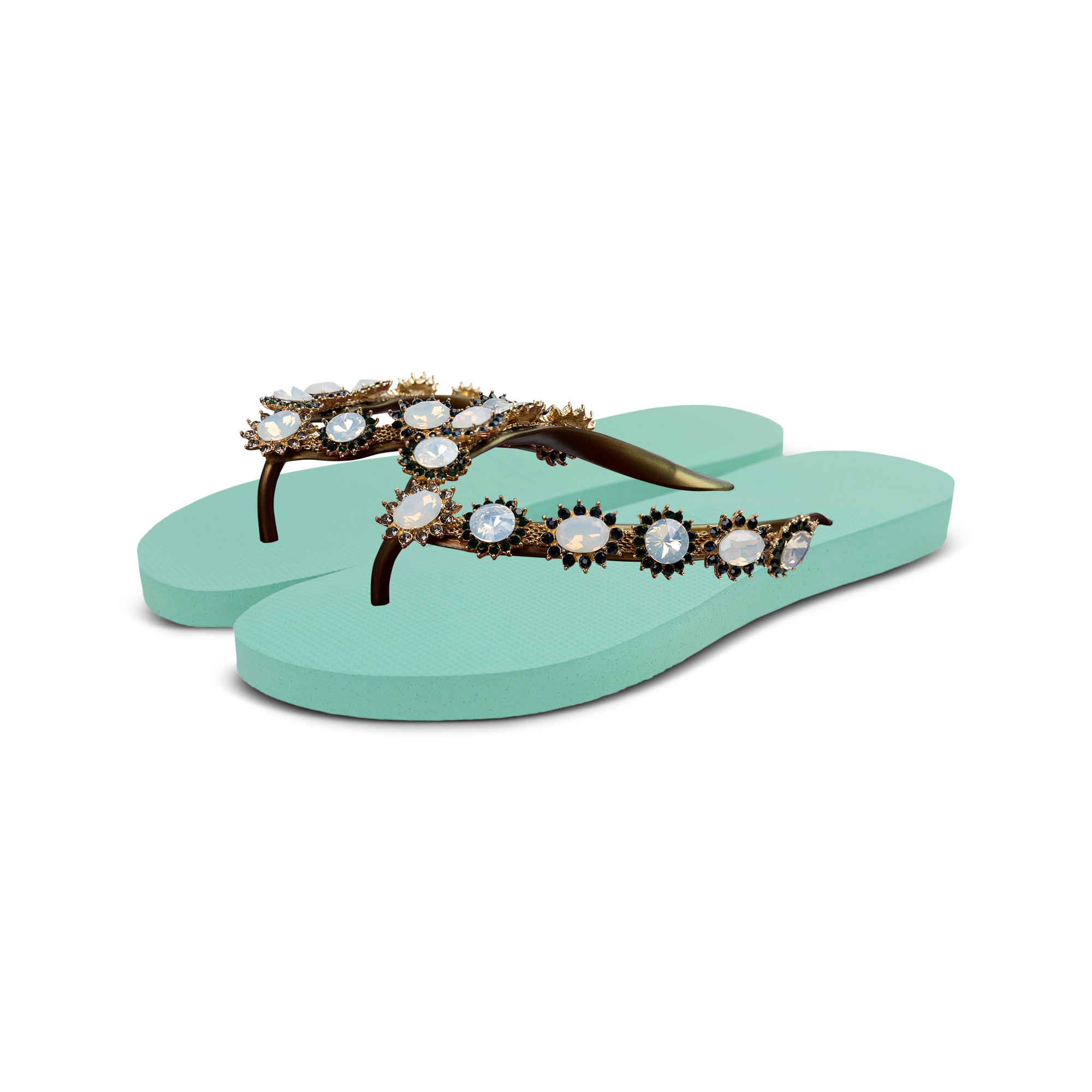 The design for these slippers is completely inspired by style icon Marilyn Monroe. She was known for her ultra-feminine looks. You can recognize the Pearl Monroe by its mother-of-pearl and colored stones. The V is covered with a shiny, silver chain.Our slippers are unique, handmade and designed with care and love. The sole, which feels silky soft on your foot, is made of rubber. The straps are made of PVC. The V is characterized by the original Uzurii logo on the straps. Our slippers are made in China and Brazil.