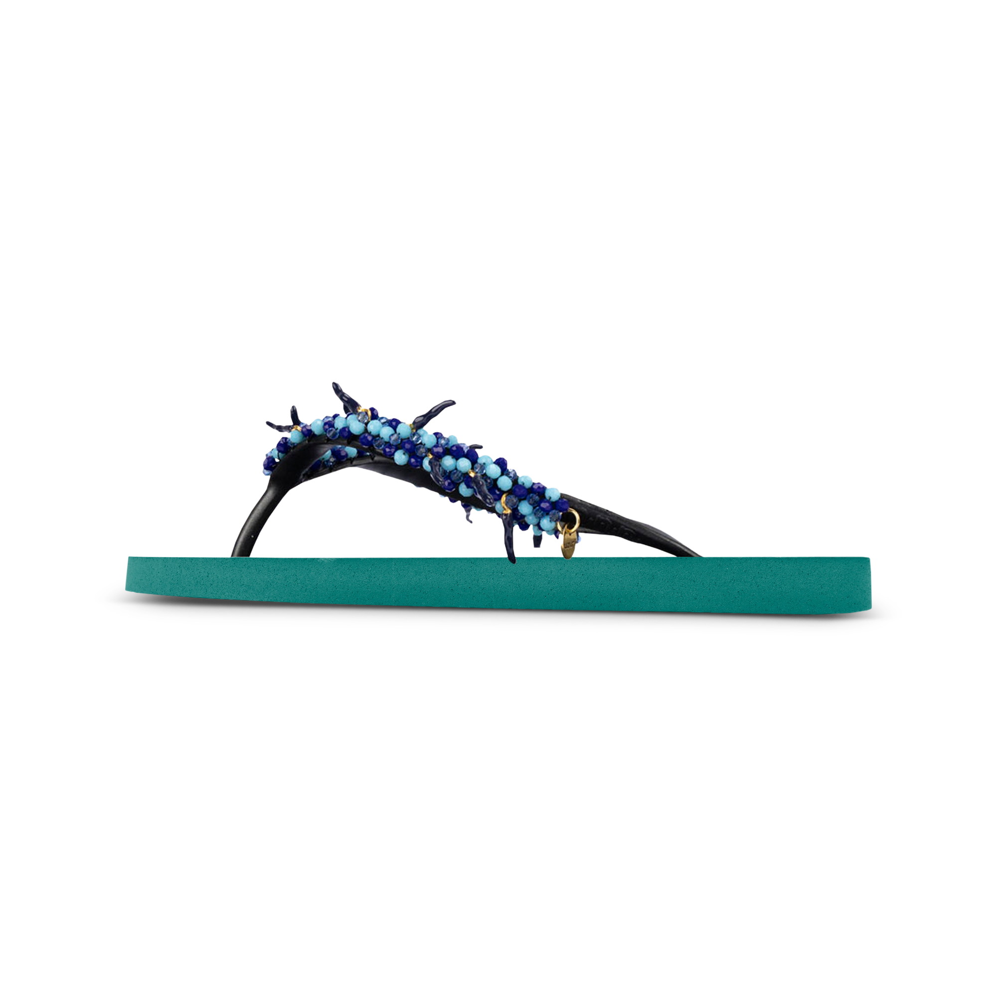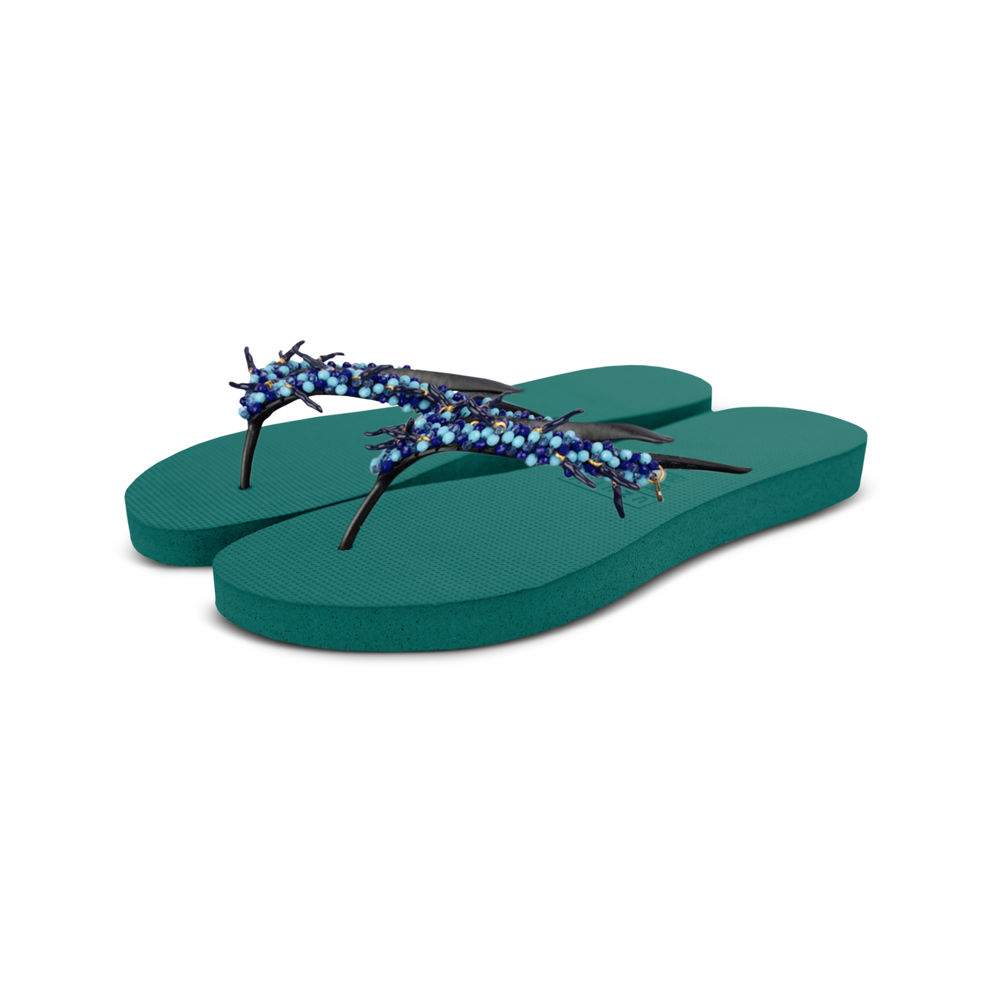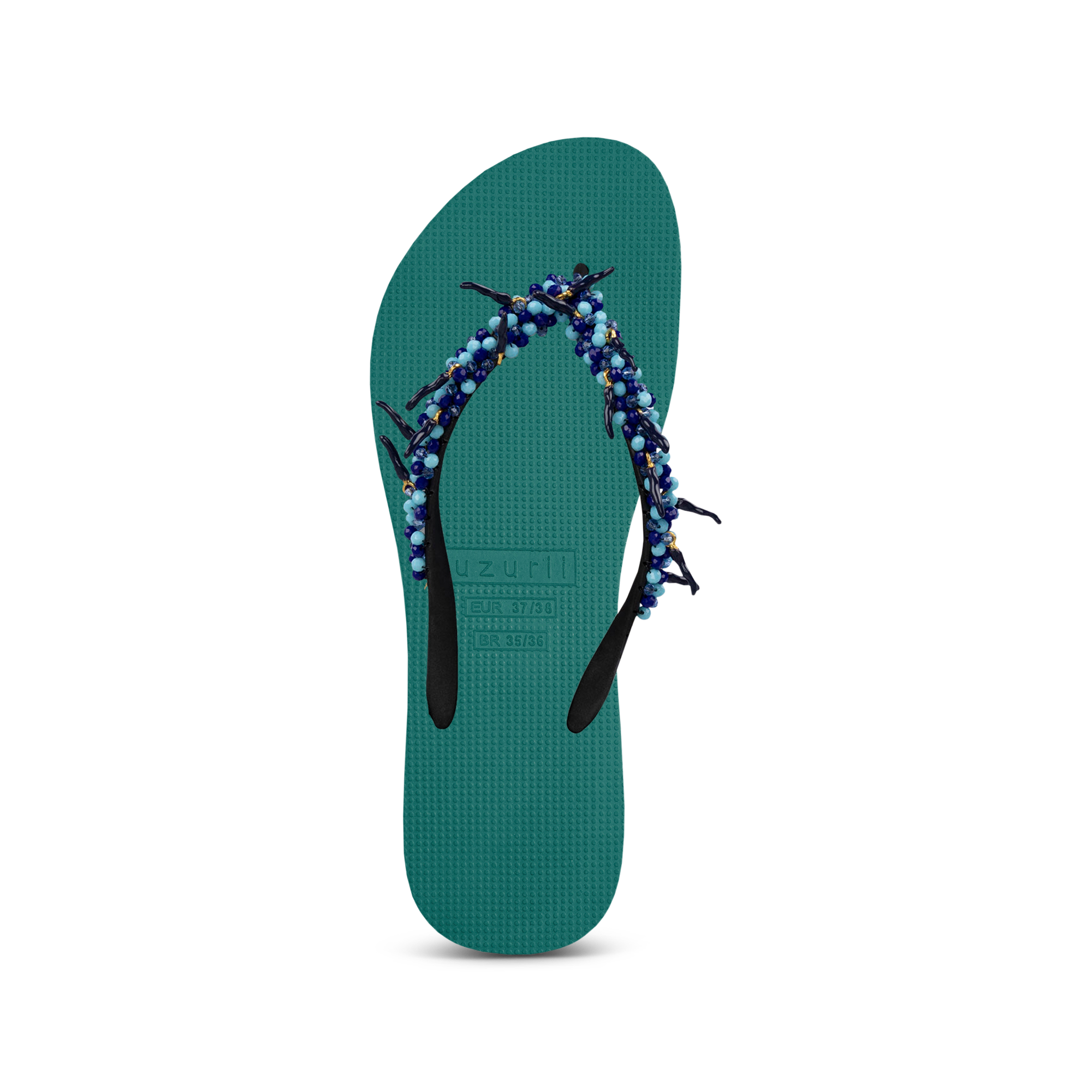Add some spice to your look with our Peppi thong sandals! Characteristic of these slippers are the small black peppers. The small turquoise stones add a bit of color. Perfect to combine with our Peppi earrings!Our slippers are unique, handmade and designed with care and love. The sole, which feels silky soft on your foot, is made of rubber. The straps are made of PVC. The V is characterized by the original Uzurii logo on the straps. Our slippers are made in China and Brazil.