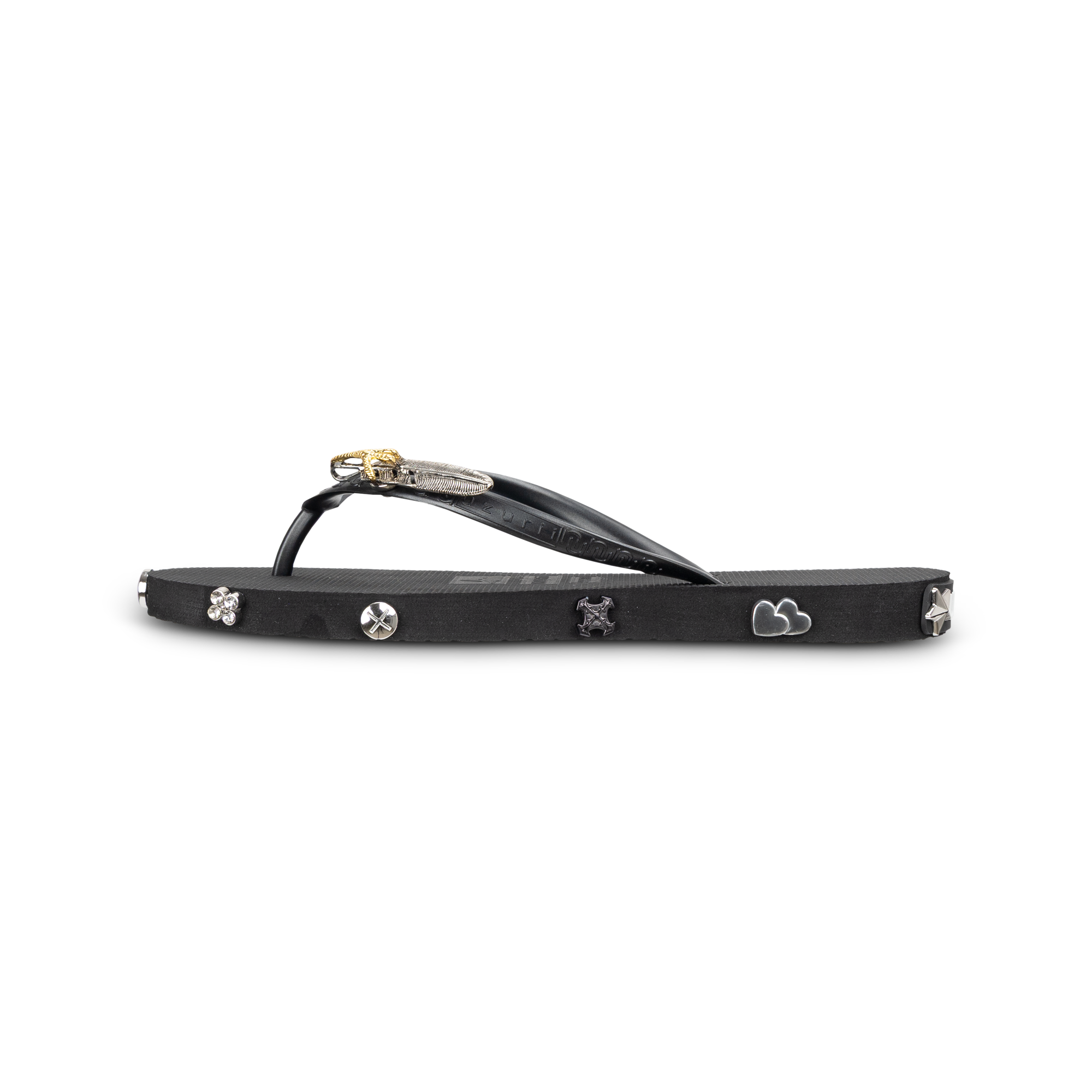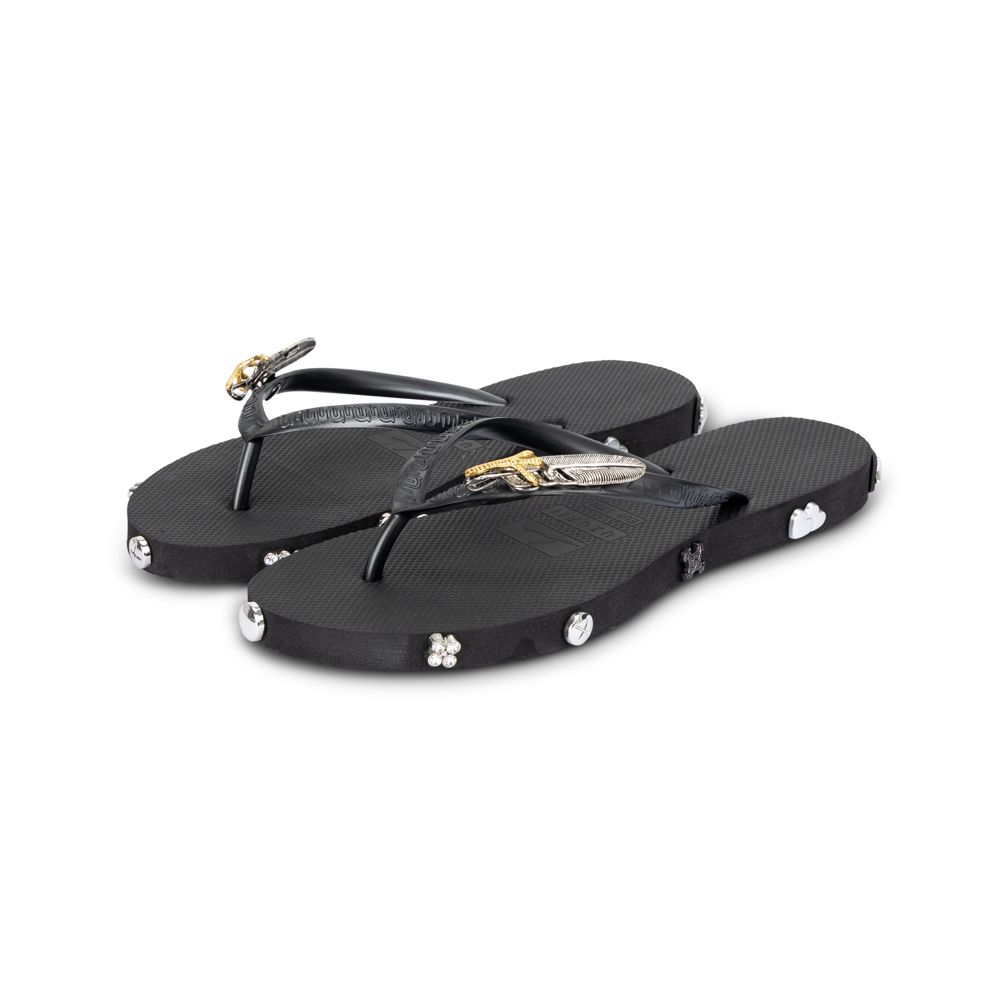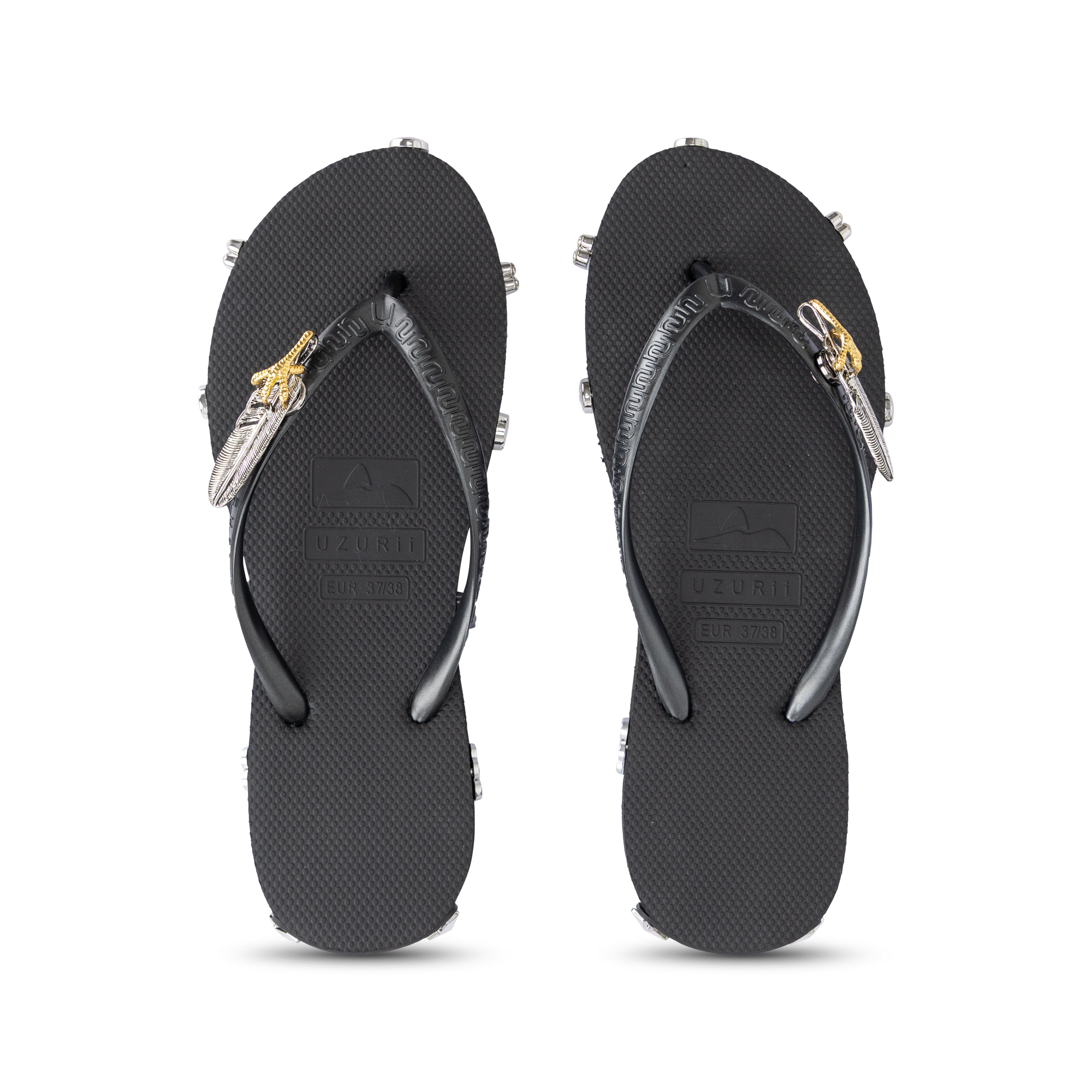 Make a statement with the Rock Star Black slippers by Uzurii. These iconic slippers combine timeless elegance with a bold, luxurious look. The deep black sole forms the perfect base for refined details: subtle crystals along the edge and a striking gold-toned ornament on the strap create a glamorous finish. Each slipper is carefully handmade and designed for both comfort and style. The soft, flexible sole feels pleasant with every step, while the sturdy strap ensures a perfect fit. Ideal for indoors, a summer city look, or a stylish beach club outfit.
