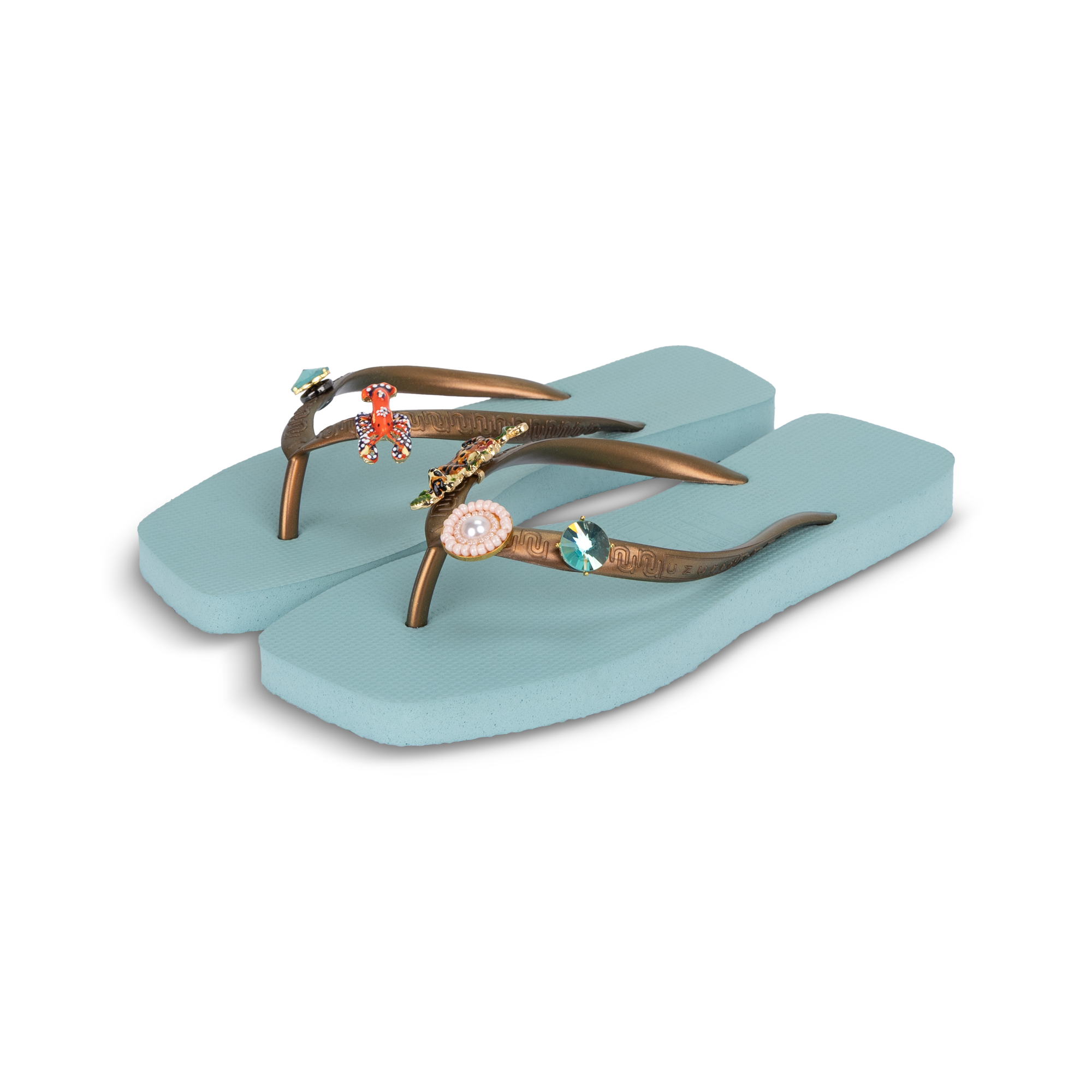 The Flore Square Grande is a bold and elegant interpretation of summer luxury. This handmade slipper stands out with its square shape and softly colored sole, combined with richly decorated straps featuring floral details, sparkling stones, and playful color accents. The larger decorative elements give this model a powerful, fashion-forward look. Thanks to its comfortable yet sturdy sole, the Flore Square Grande offers optimal comfort, while the striking flowers and stones create a true eye-catcher. Ideal for women who dare to choose a statement look without compromising on comfort.