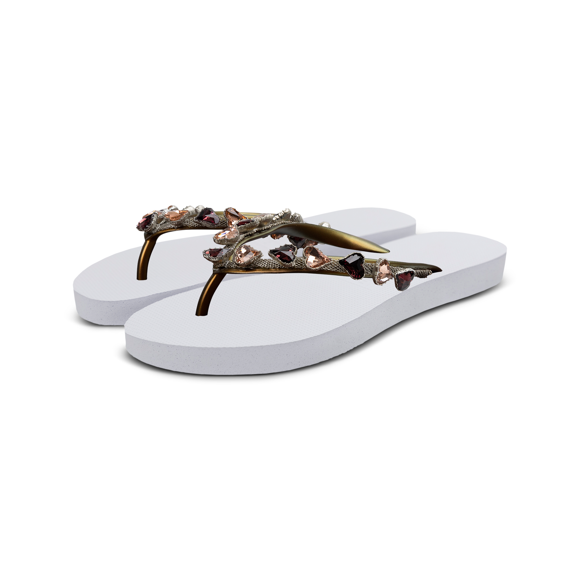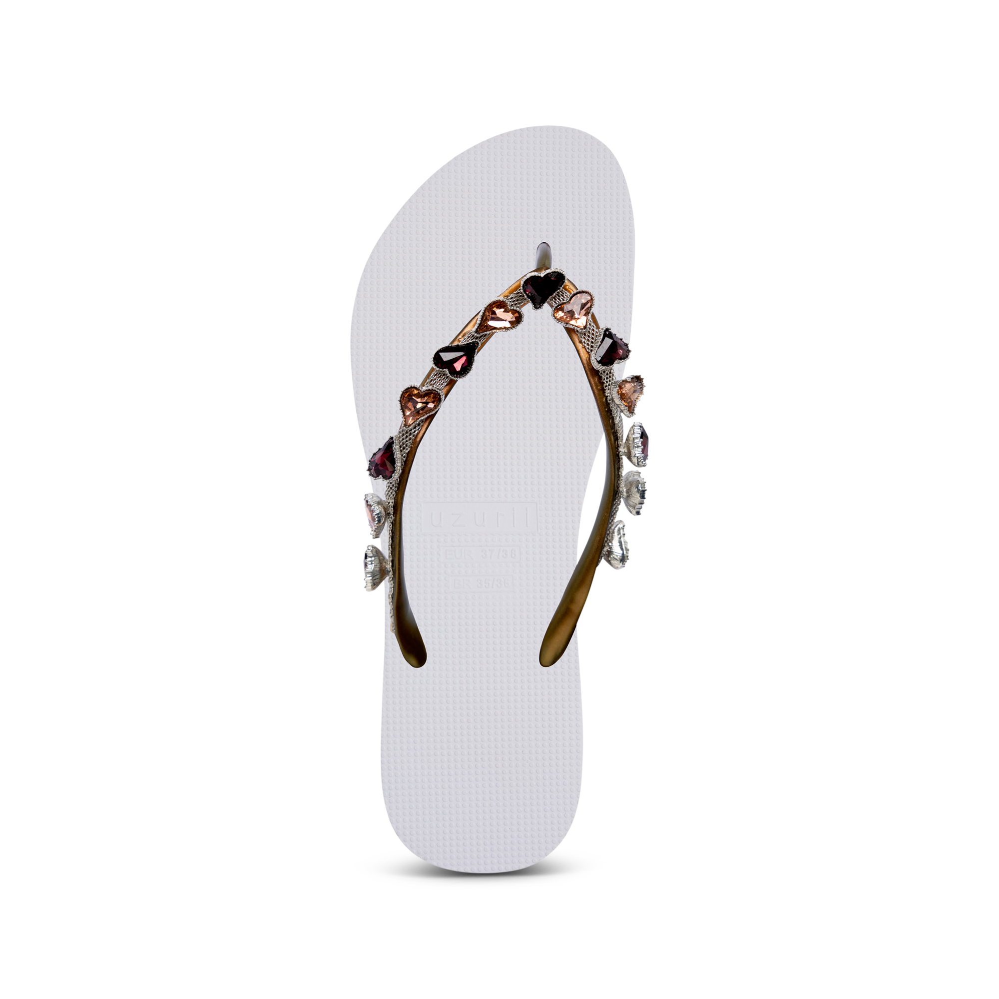 Ah, l'amour! Deze schattige, bronzen hartjes geven een schattige uitstraling aan de Heart Bronze teenslippers. De gouden ketting die over de V loopt is een stoere tegenhanger van de donkerrode en bronskleurige edelstenen. De bandjes zijn versierd met het originele Uzurii logo.Onze slippers zijn uniek, handgemaakt en met aandacht ontworpen. De zool, die zijdezacht aanvoelt aan je voet, is gemaakt van rubber. De bandjes zijn gemaakt van PVC. De V kenmerkt zich door het originele Uzurii logo op de bandjes. Onze slippers worden gemaakt in China en BraziliÎ