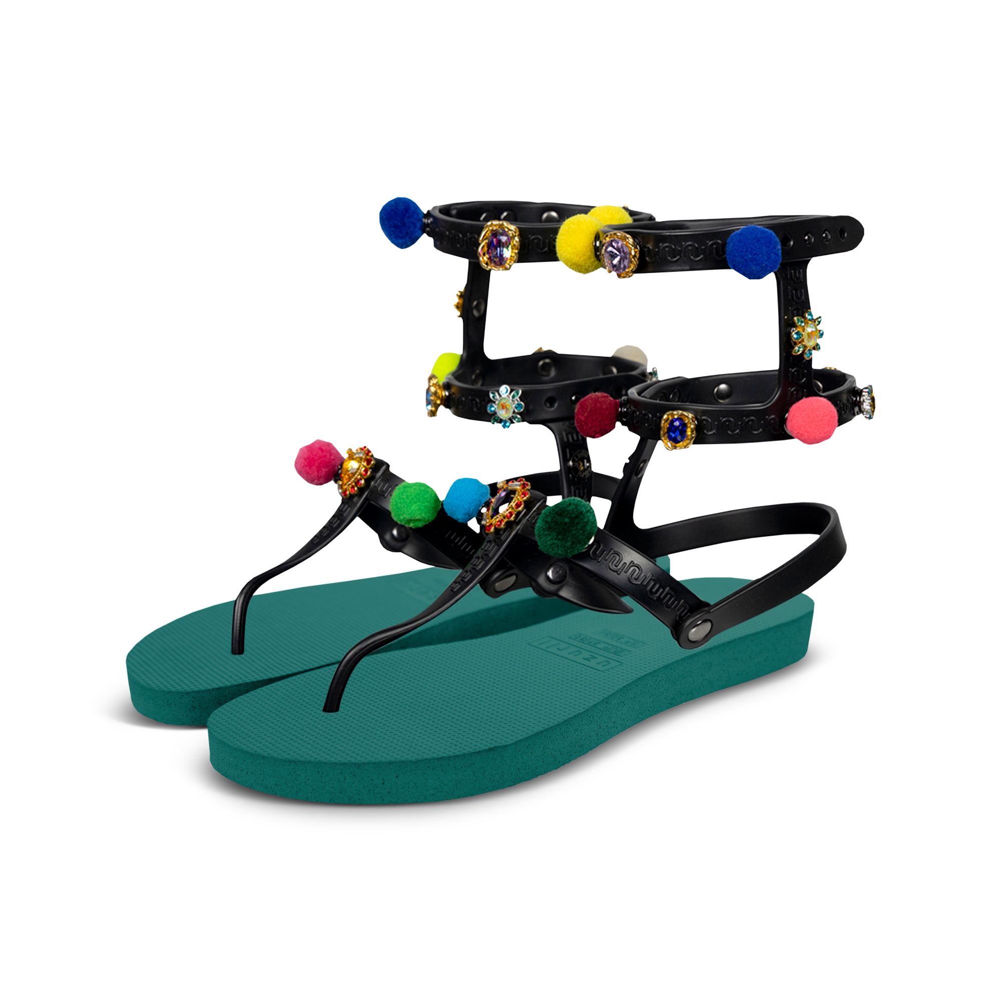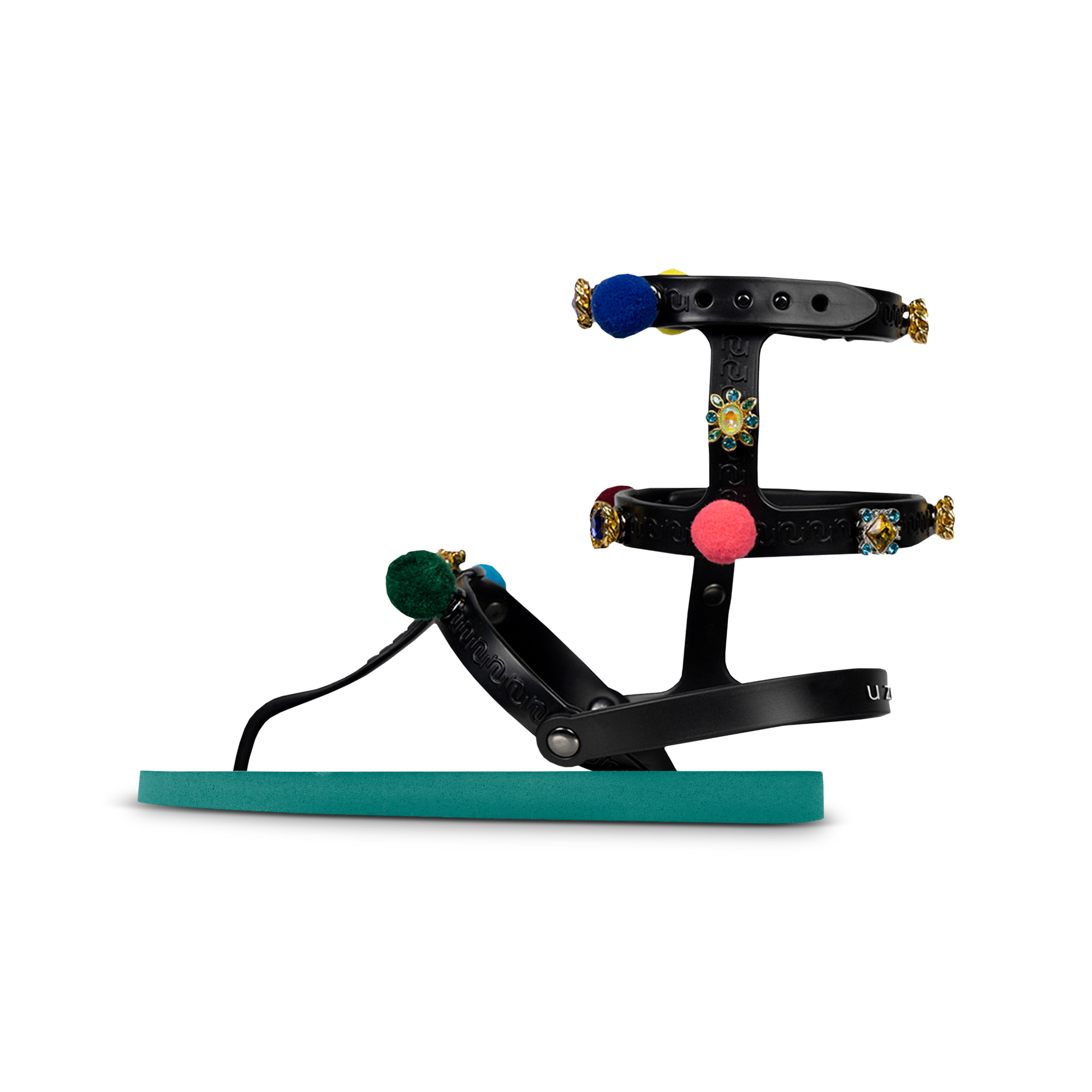 Waan je op Ibiza met onze Mystique Pompom! Deze sandalen herken je aan de pompons en kleurrijke stenen. Door de drukknoopjes, kun je de pompons en stenen zelf verwisselen. Kies uit een groot aantal stenen uit onze accessoires lijn. Geef je slippers in een handomdraai een nieuwe look. Op zoek naar comfort? De Mystique Pompom geeft extra steun door de bandjes over de hiel.Onze slippers zijn uniek, handgemaakt en met zorg en liefde ontworpen. De zool, die zijdezacht aanvoelt aan je voet, is gemaakt van rubber. De bandjes zijn gemaakt van PVC. De V kenmerkt zich door het originele Uzurii logo op de bandjes. Onze slippers worden gemaakt in China en BraziliÎ.