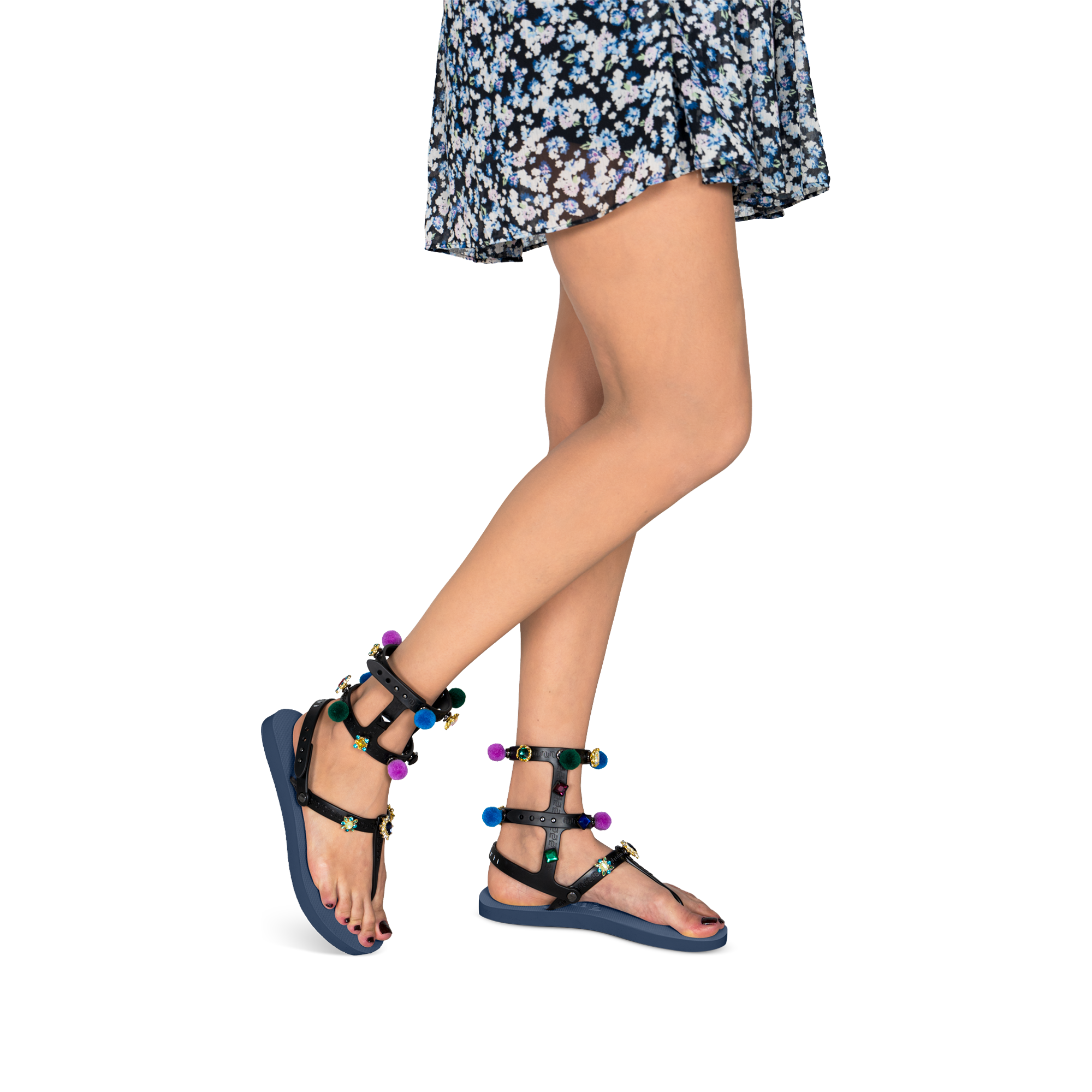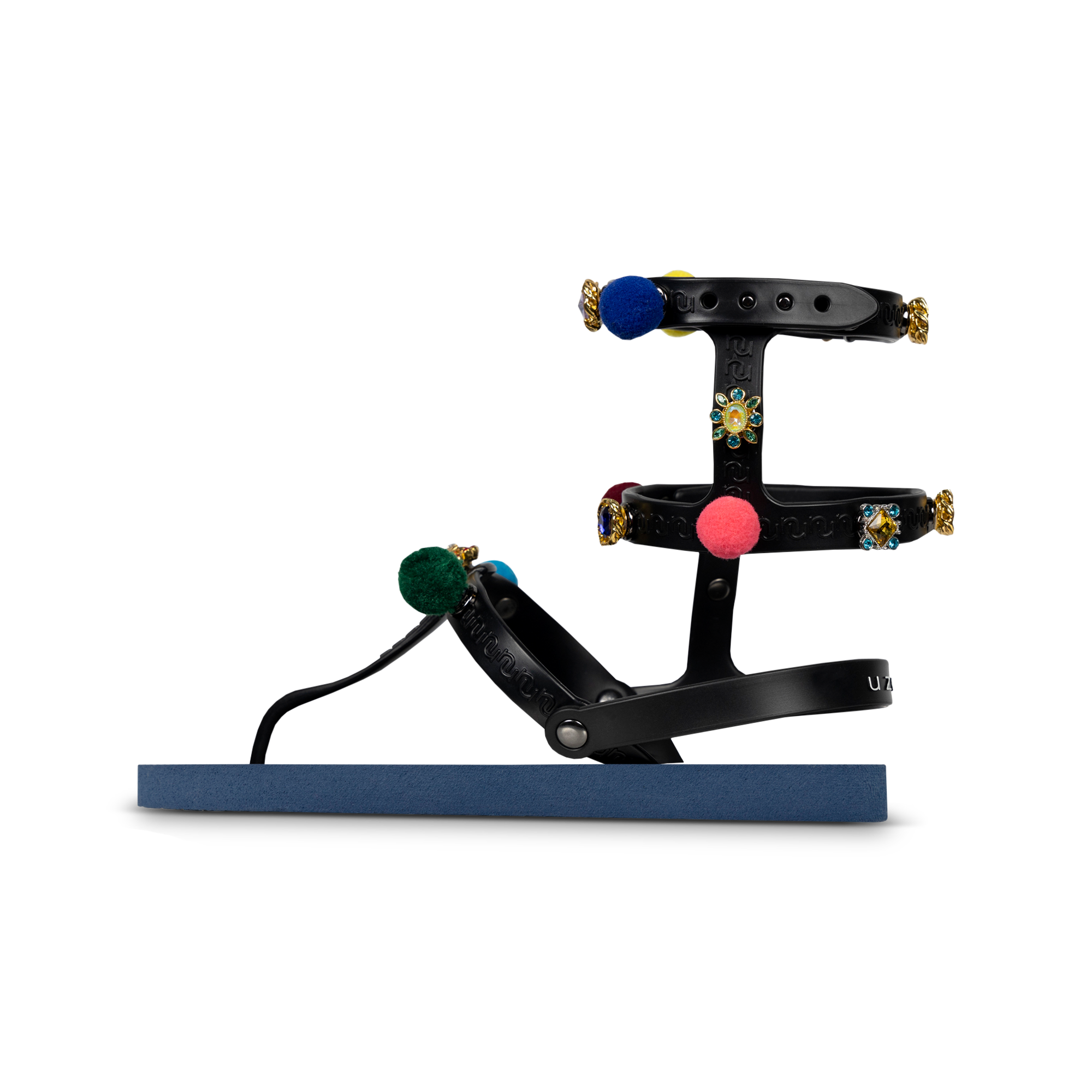 Waan je op Ibiza met onze Mystique Pompom! Deze sandalen herken je aan de pompons en kleurrijke stenen. Door de drukknoopjes, kun je de pompons en stenen zelf verwisselen. Kies uit een groot aantal stenen uit onze accessoires lijn. Geef je slippers in een handomdraai een nieuwe look. Op zoek naar comfort? De Mystique Pompom geeft extra steun door de bandjes over de hiel.Onze slippers zijn uniek, handgemaakt en met zorg en liefde ontworpen. De zool, die zijdezacht aanvoelt aan je voet, is gemaakt van rubber. De bandjes zijn gemaakt van PVC. De V kenmerkt zich door het originele Uzurii logo op de bandjes. Onze slippers worden gemaakt in China en BraziliÎ.