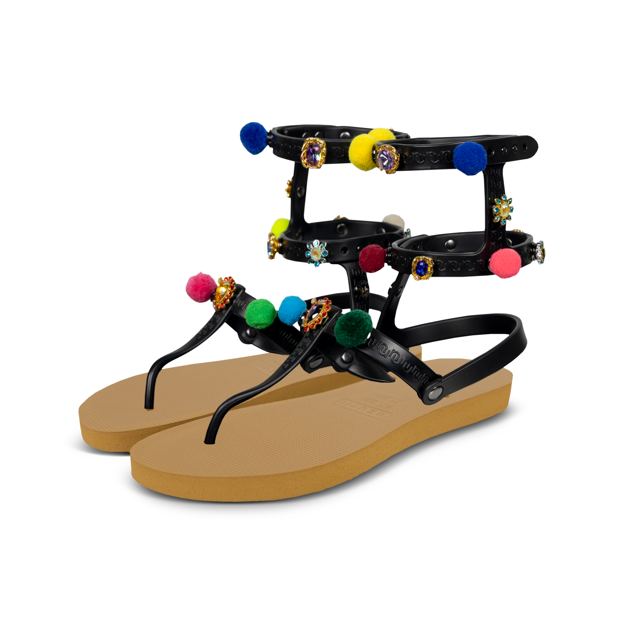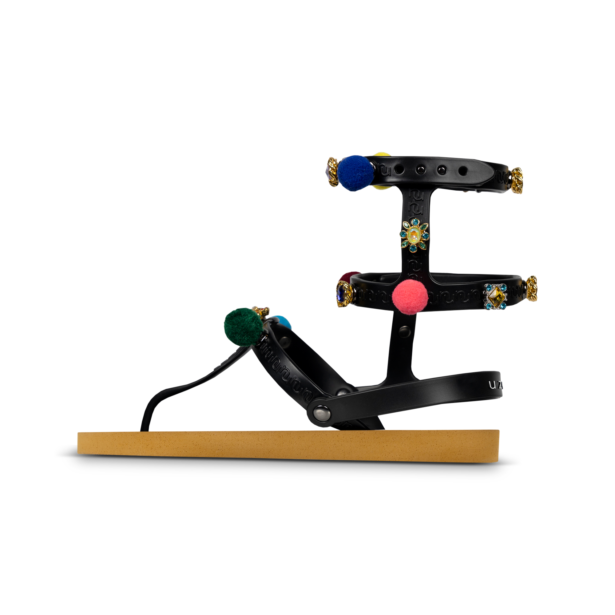 Waan je op Ibiza met onze Mystique Pompom! Deze sandalen herken je aan de pompons en kleurrijke stenen. Door de drukknoopjes, kun je de pompons en stenen zelf verwisselen. Kies uit een groot aantal stenen uit onze accessoires lijn. Geef je slippers in een handomdraai een nieuwe look. Op zoek naar comfort? De Mystique Pompom geeft extra steun door de bandjes over de hiel.Onze slippers zijn uniek, handgemaakt en met zorg en liefde ontworpen. De zool, die zijdezacht aanvoelt aan je voet, is gemaakt van rubber. De bandjes zijn gemaakt van PVC. De V kenmerkt zich door het originele Uzurii logo op de bandjes. Onze slippers worden gemaakt in China en BraziliÎ.