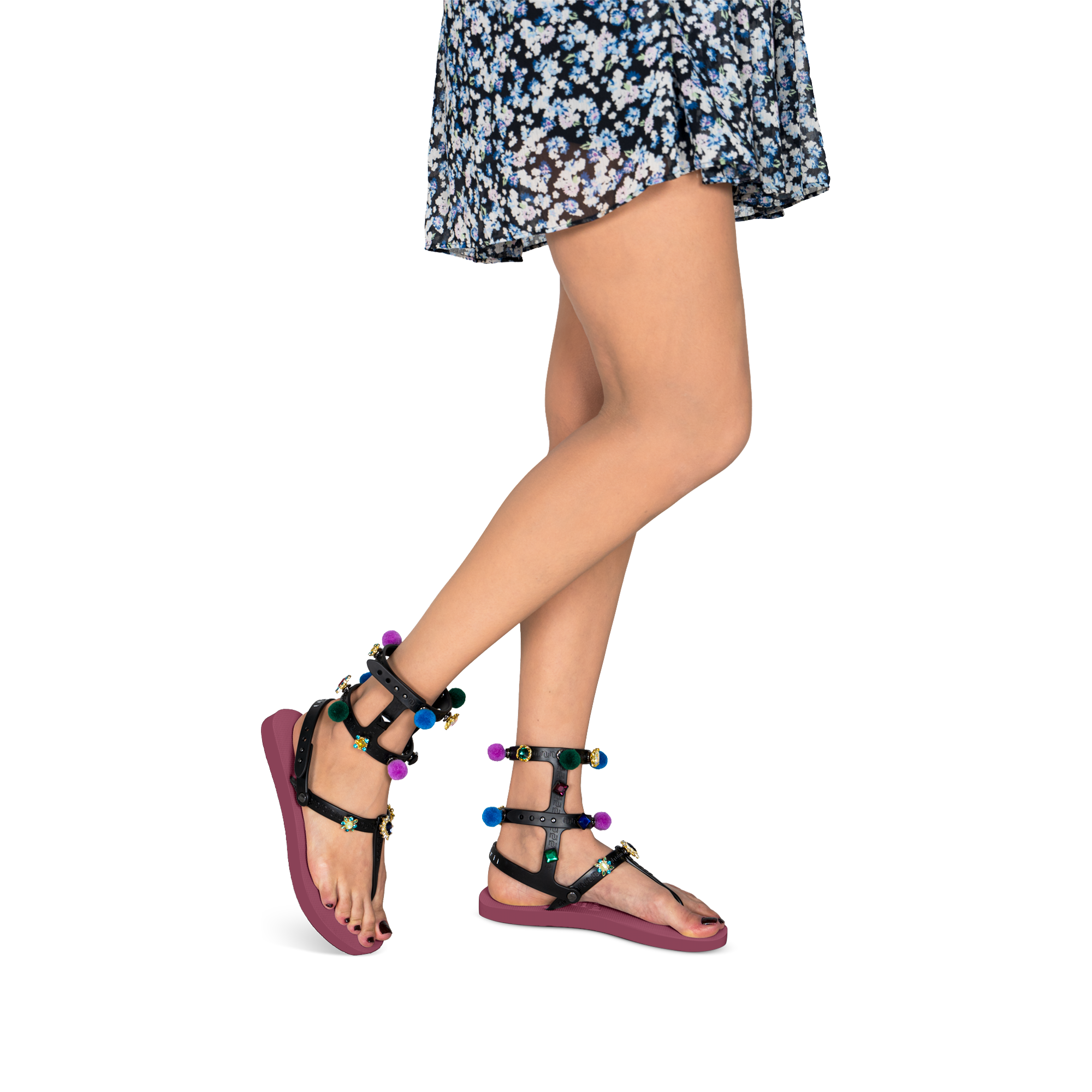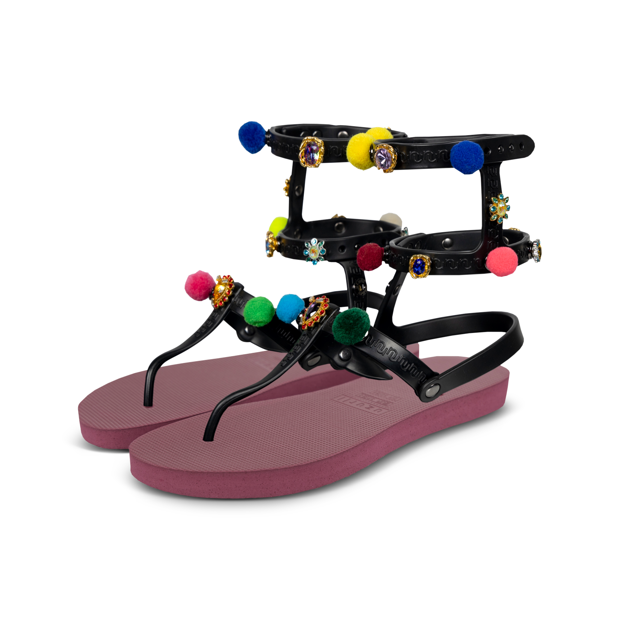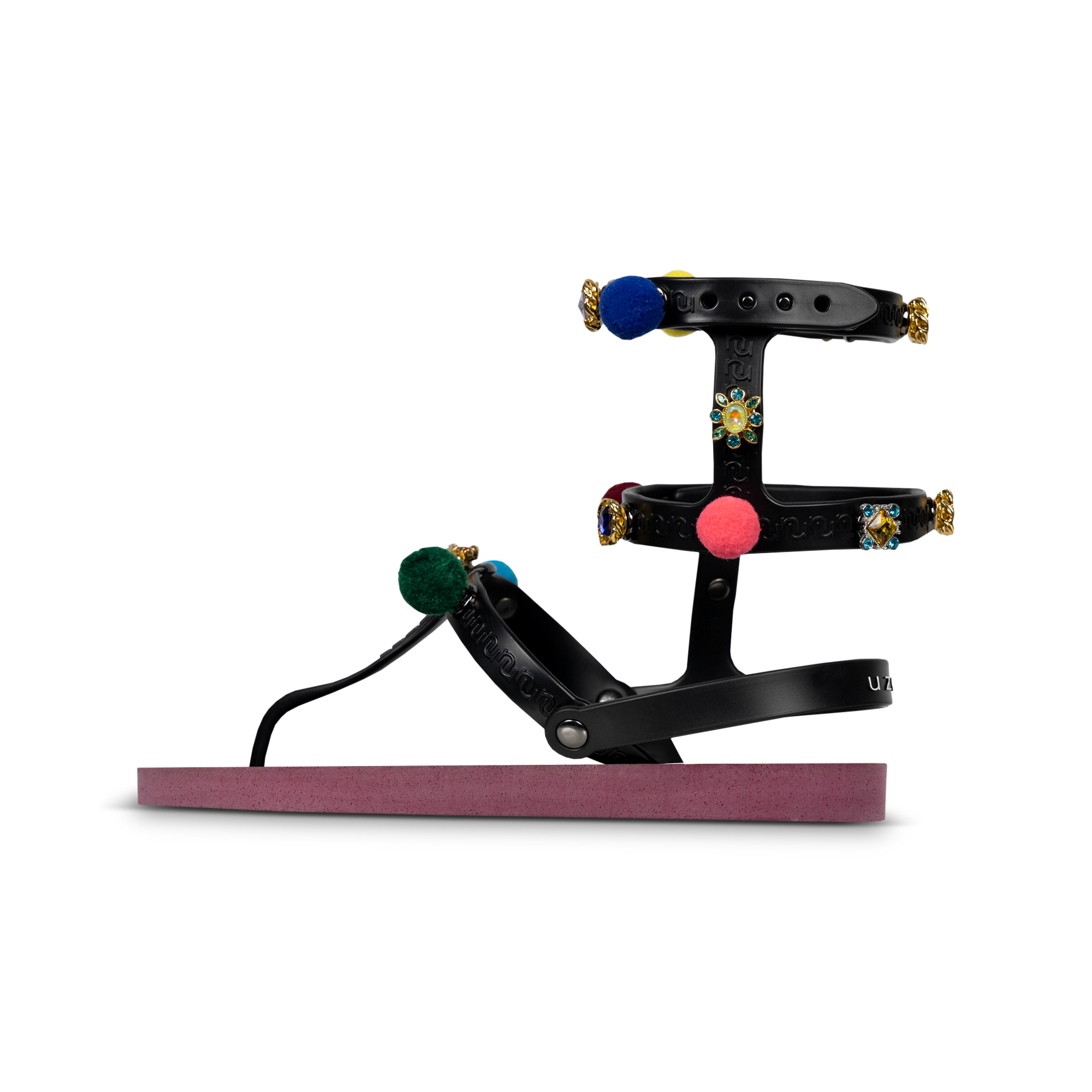 Waan je op Ibiza met onze Mystique Pompom! Deze sandalen herken je aan de pompons en kleurrijke stenen. Door de drukknoopjes, kun je de pompons en stenen zelf verwisselen. Kies uit een groot aantal stenen uit onze accessoires lijn. Geef je slippers in een handomdraai een nieuwe look. Op zoek naar comfort? De Mystique Pompom geeft extra steun door de bandjes over de hiel.Onze slippers zijn uniek, handgemaakt en met zorg en liefde ontworpen. De zool, die zijdezacht aanvoelt aan je voet, is gemaakt van rubber. De bandjes zijn gemaakt van PVC. De V kenmerkt zich door het originele Uzurii logo op de bandjes. Onze slippers worden gemaakt in China en BraziliÎ.
