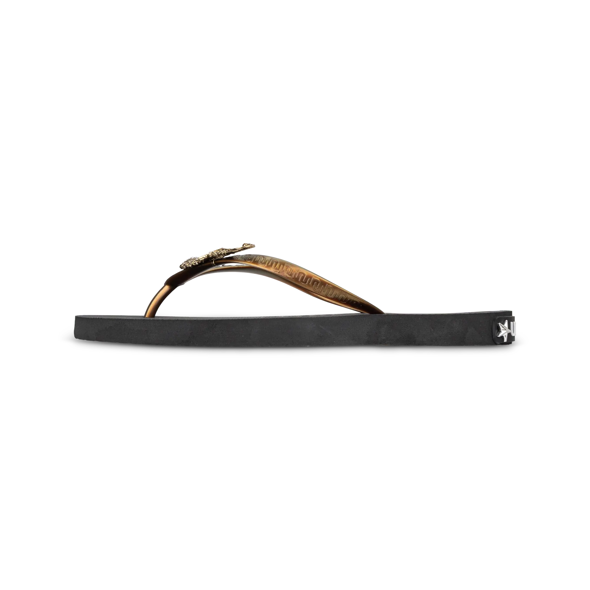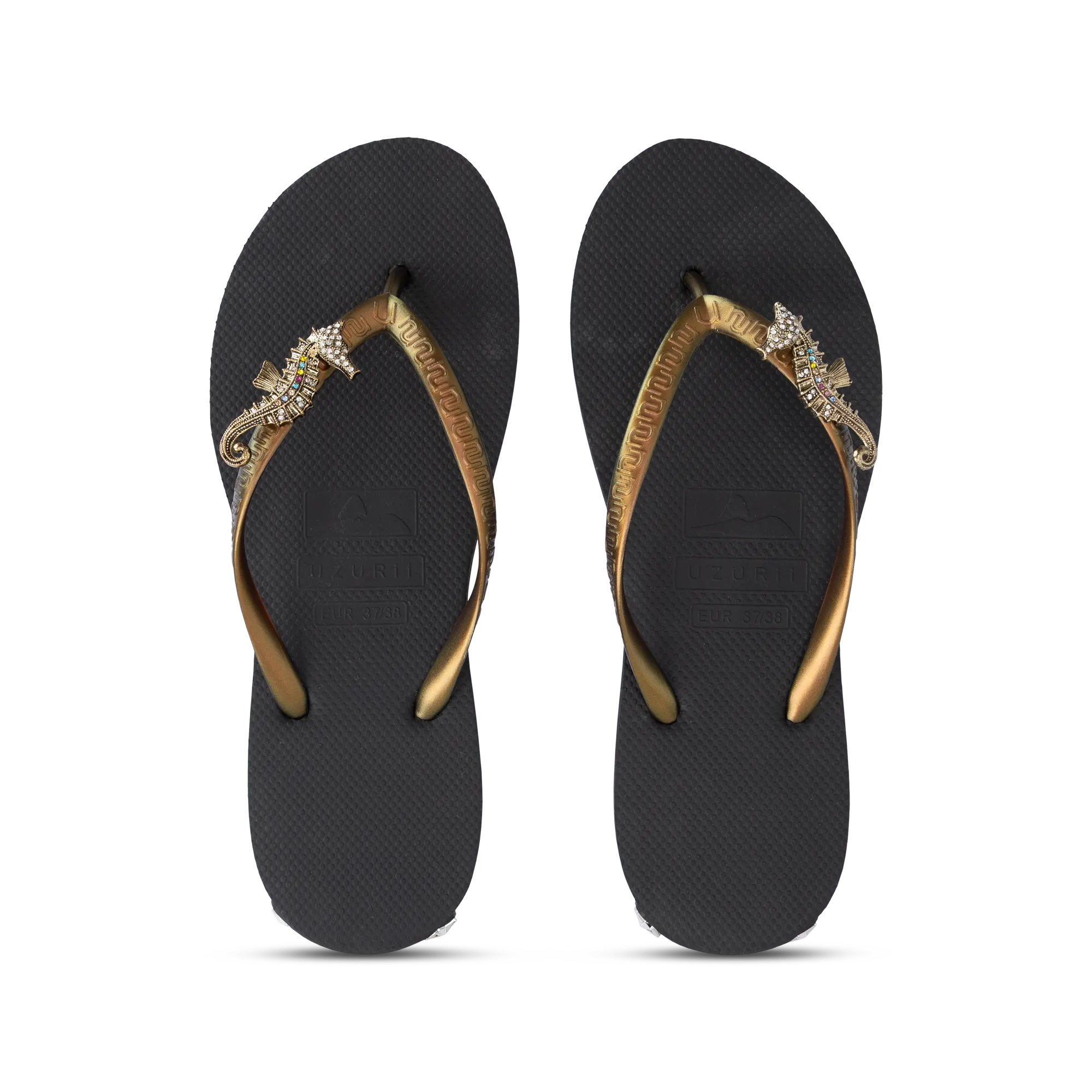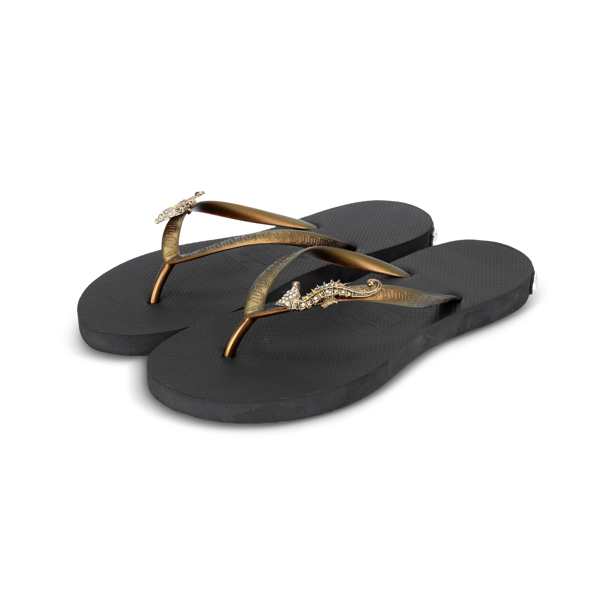 De Seahorse Switch is geïnspireerd op de elegante vormen van de zee. De verfijnde zeepaard-clip, rijkelijk bezet met sprankelende steentjes, geeft deze slipper een unieke en luxueuze uitstraling. Het goudkleurige bandje vormt een prachtig contrast met de zwarte zool en zorgt voor een krachtige, stijlvolle look. Dankzij het Switch-concept kun je de clip verwisselen en je slipper aanpassen aan je mood of outfit. Van beach chic tot evening glam – één slipper, eindeloze mogelijkheden. De zool is lichtgewicht, flexibel en comfortabel, ontworpen voor zowel binnen als buiten. Zoals je van Uzurii mag verwachten, combineert dit model glamour met draagcomfort.