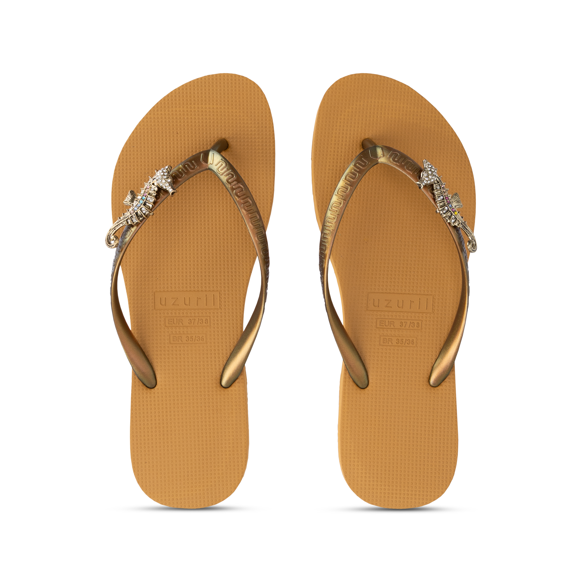 De Seahorse Switch is geïnspireerd op de elegante vormen van de zee. De verfijnde zeepaard-clip, rijkelijk bezet met sprankelende steentjes, geeft deze slipper een unieke en luxueuze uitstraling. Het goudkleurige bandje vormt een prachtig contrast met de zwarte zool en zorgt voor een krachtige, stijlvolle look. Dankzij het Switch-concept kun je de clip verwisselen en je slipper aanpassen aan je mood of outfit. Van beach chic tot evening glam – één slipper, eindeloze mogelijkheden. De zool is lichtgewicht, flexibel en comfortabel, ontworpen voor zowel binnen als buiten. Zoals je van Uzurii mag verwachten, combineert dit model glamour met draagcomfort.