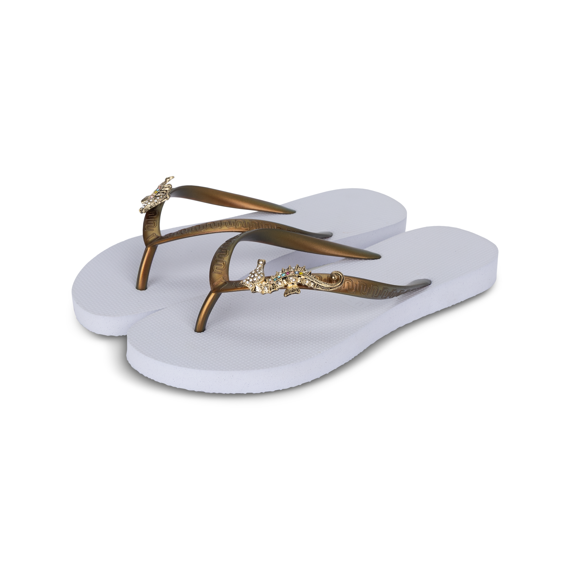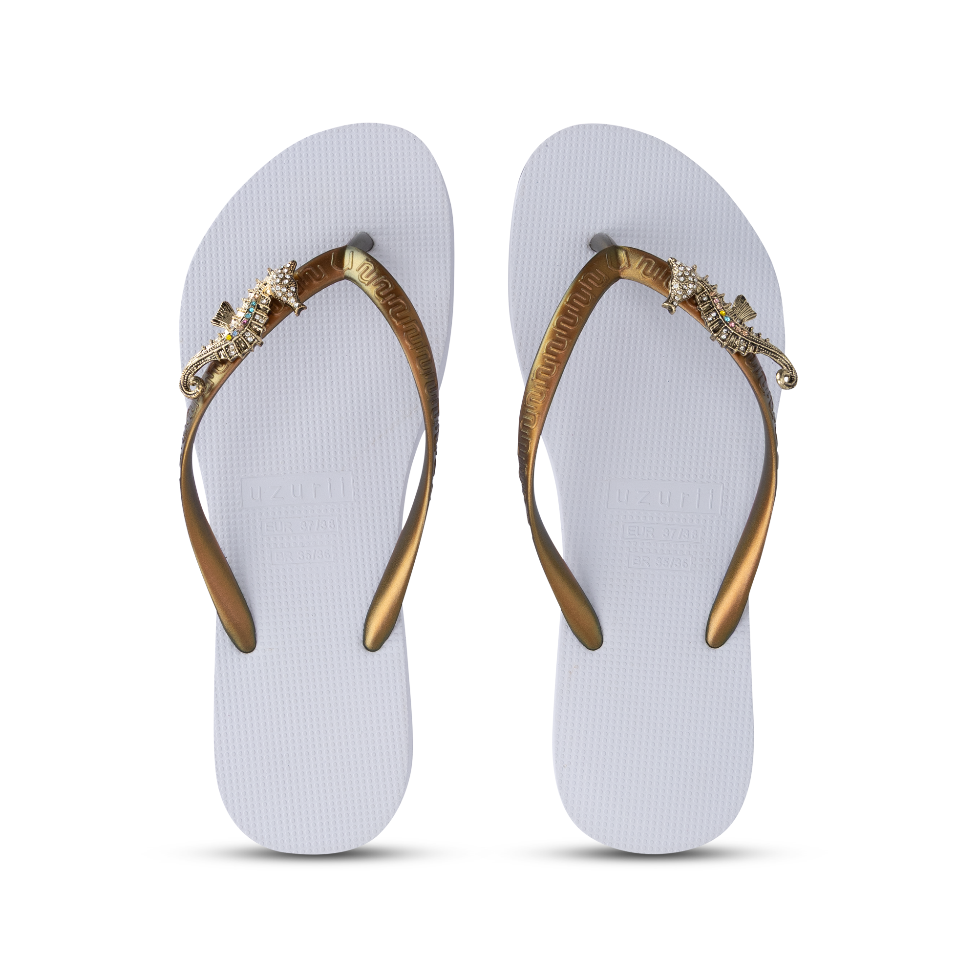 De Seahorse Switch is geïnspireerd op de elegante vormen van de zee. De verfijnde zeepaard-clip, rijkelijk bezet met sprankelende steentjes, geeft deze slipper een unieke en luxueuze uitstraling. Het goudkleurige bandje vormt een prachtig contrast met de zwarte zool en zorgt voor een krachtige, stijlvolle look. Dankzij het Switch-concept kun je de clip verwisselen en je slipper aanpassen aan je mood of outfit. Van beach chic tot evening glam – één slipper, eindeloze mogelijkheden. De zool is lichtgewicht, flexibel en comfortabel, ontworpen voor zowel binnen als buiten. Zoals je van Uzurii mag verwachten, combineert dit model glamour met draagcomfort.