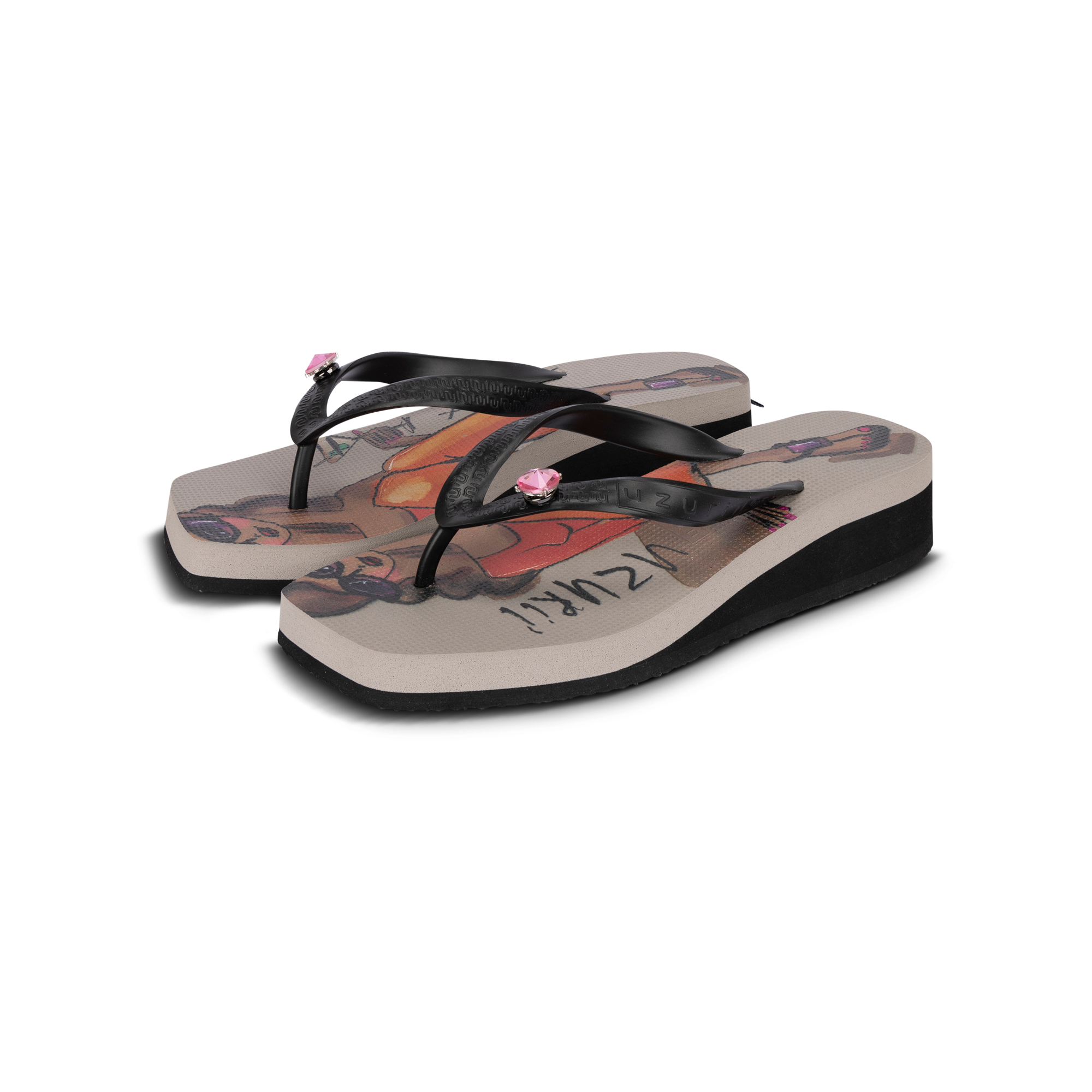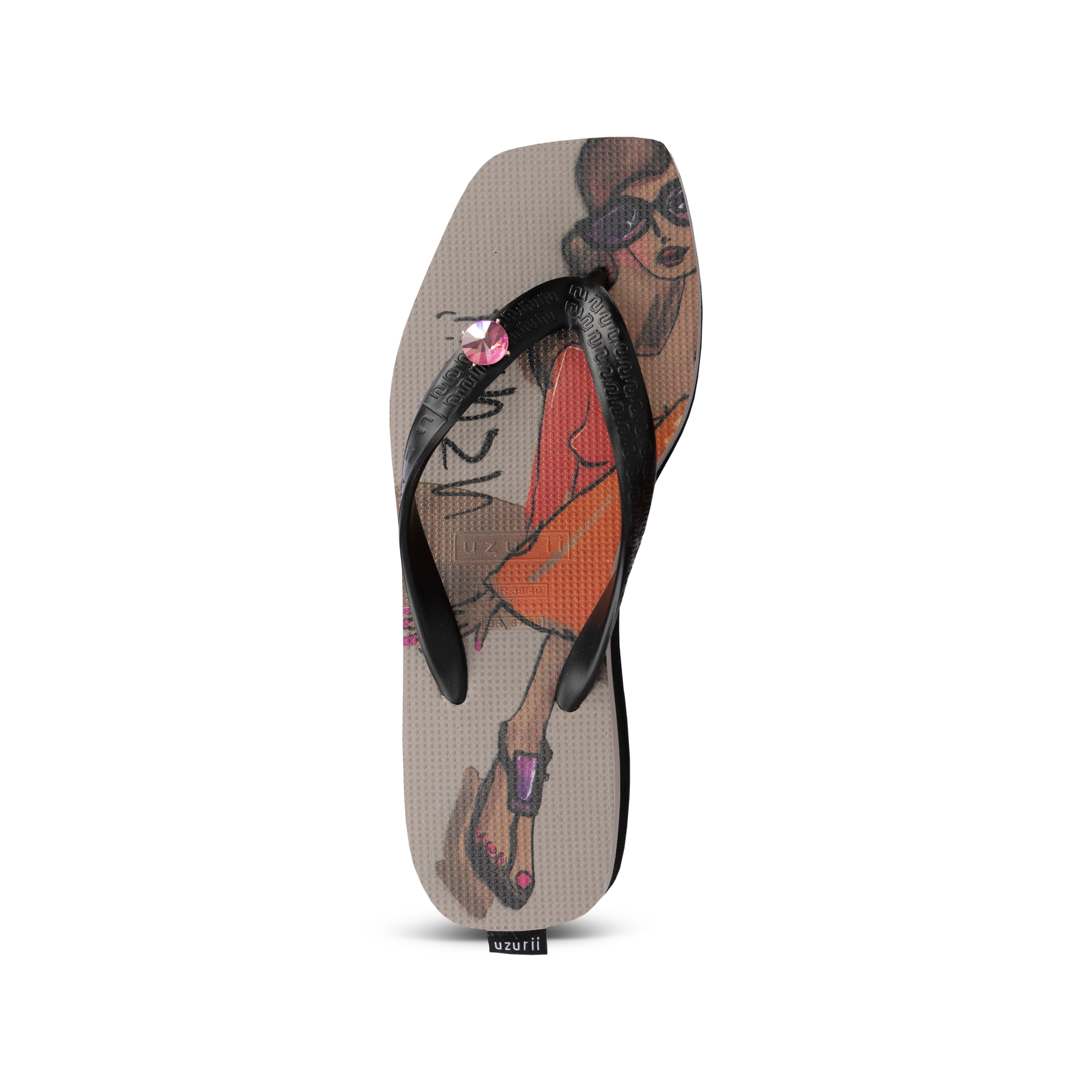 De Beach Printed Cocktail Girl is niet zoals alle anderen, net als jij! De vierkante plateauzool is versierd met een handgemaakte tekening (optioneel: voor ons ontworpen door Noortje den Oudsten). De print van deze slippers is leuk en speels. De V heeft een effen kleur en een druk knop waarmee je de switch button makkelijk zelf kunt verwisselen. Kies uit een groot aantal stenen uit onze accessoirelijn. Zo tover je jouw paar flip flops eenvoudig om tot een nieuwe look!Onze slippers zijn uniek, handgemaakt en met zorg en liefde ontworpen. De zool, die zijdezacht aanvoelt aan je voet, is gemaakt van rubber. De bandjes zijn gemaakt van PVC. De V kenmerkt zich door het originele Uzurii logo op de bandjes. Onze slippers worden gemaakt in China en BraziliÎ.