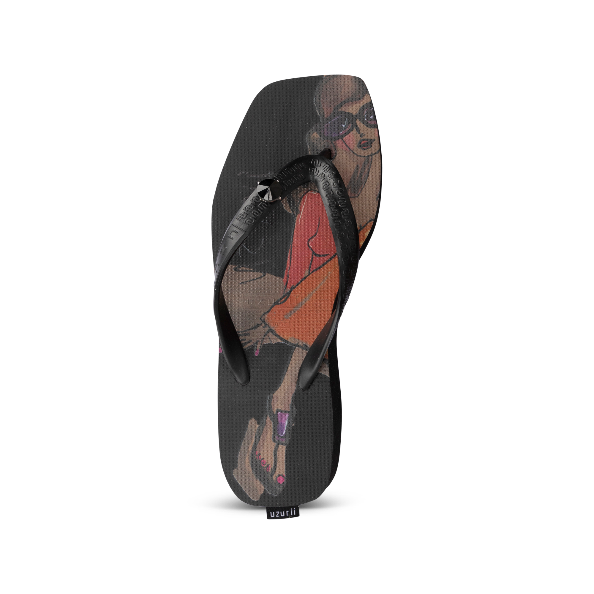 De Beach Printed Cocktail Girl is niet zoals alle anderen, net als jij! De vierkante plateauzool is versierd met een handgemaakte tekening (optioneel: voor ons ontworpen door Noortje den Oudsten). De print van deze slippers is leuk en speels. De V heeft een effen kleur en een druk knop waarmee je de switch button makkelijk zelf kunt verwisselen. Kies uit een groot aantal stenen uit onze accessoirelijn. Zo tover je jouw paar flip flops eenvoudig om tot een nieuwe look!Onze slippers zijn uniek, handgemaakt en met zorg en liefde ontworpen. De zool, die zijdezacht aanvoelt aan je voet, is gemaakt van rubber. De bandjes zijn gemaakt van PVC. De V kenmerkt zich door het originele Uzurii logo op de bandjes. Onze slippers worden gemaakt in China en BraziliÎ.