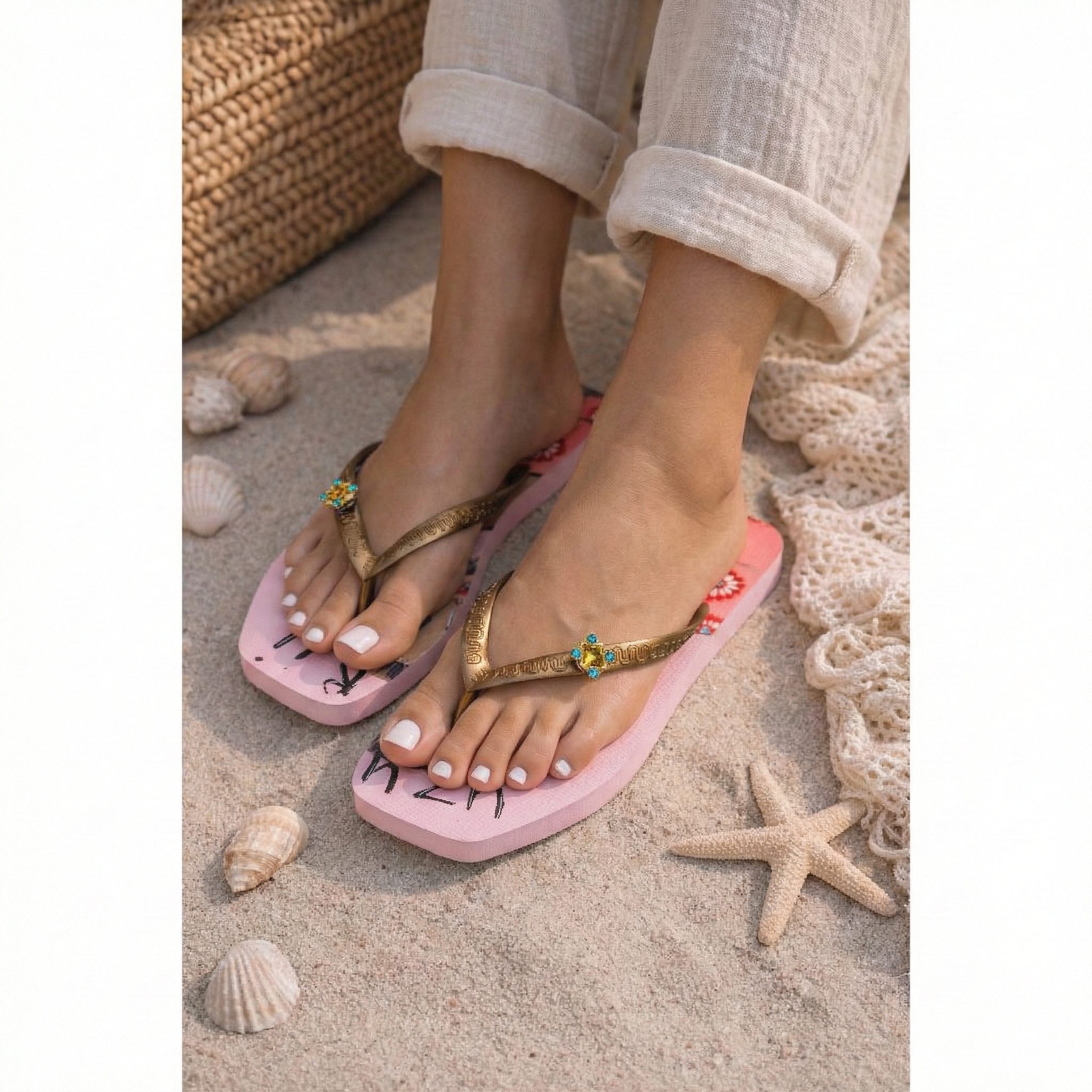 De Beach Printed Claudia is niet zoals alle anderen, net als jij! De vierkante plateauzool is versierd met een handgemaakte tekening (optioneel: voor ons ontworpen door Noortje den Oudsten). De print van deze slippers is leuk en speels. De V heeft een effen kleur en een druk knop waarmee je de switch button makkelijk zelf kunt verwisselen. Kies uit een groot aantal stenen uit onze accessoirelijn. Zo tover je jouw paar flip flops eenvoudig om tot een nieuwe look!Onze slippers zijn uniek, handgemaakt en met zorg en liefde ontworpen. De zool, die zijdezacht aanvoelt aan je voet, is gemaakt van rubber. De bandjes zijn gemaakt van PVC. De V kenmerkt zich door het originele Uzurii logo op de bandjes. Onze slippers worden gemaakt in China en BraziliÎ.