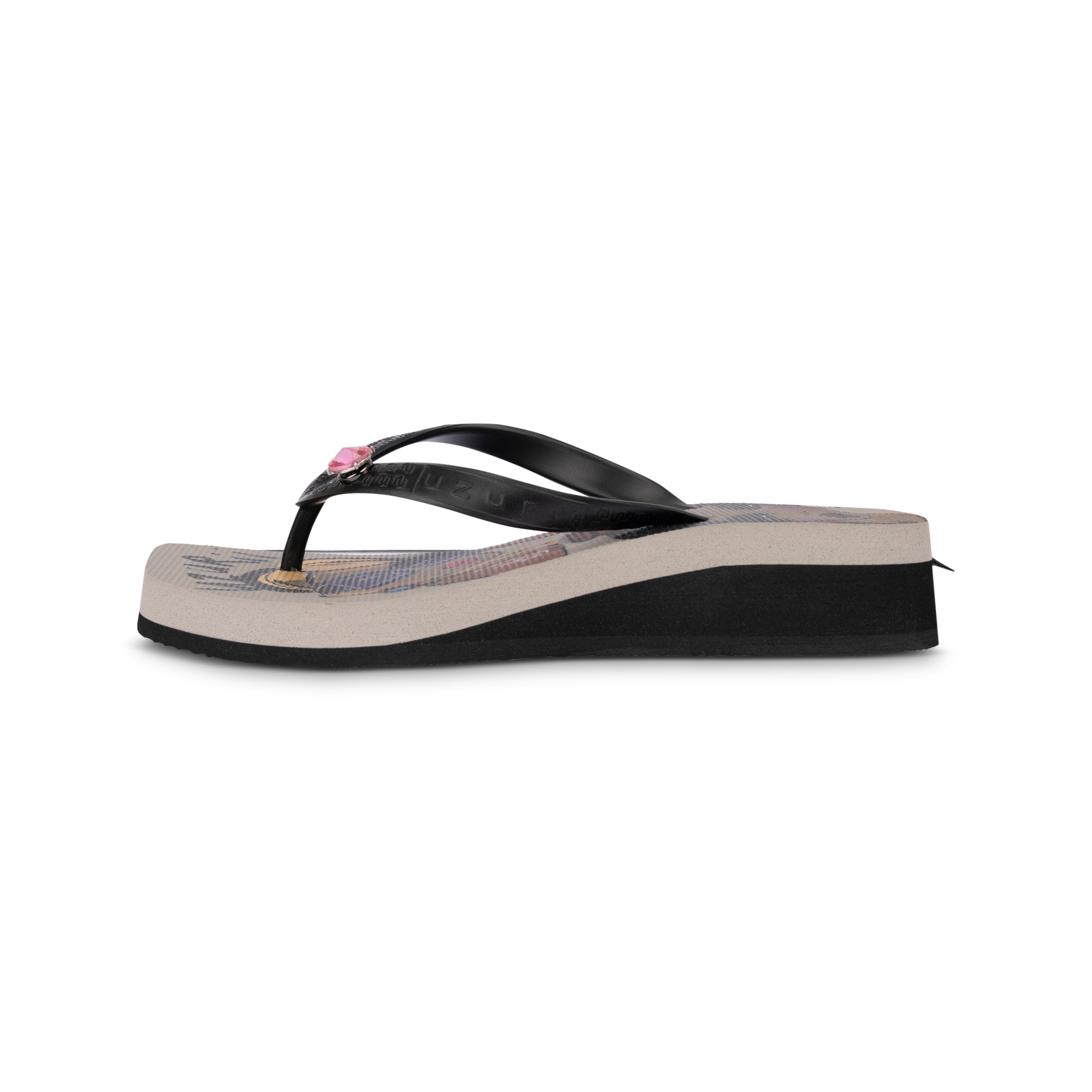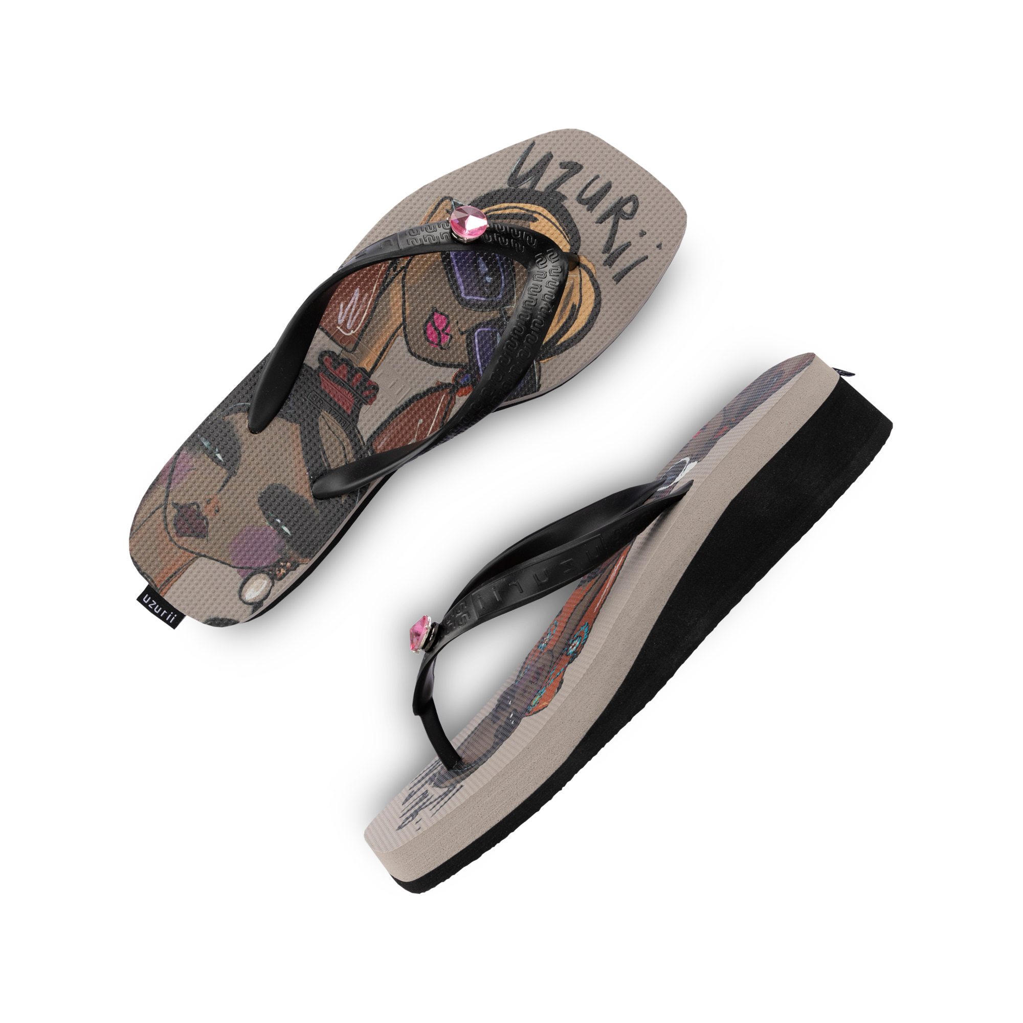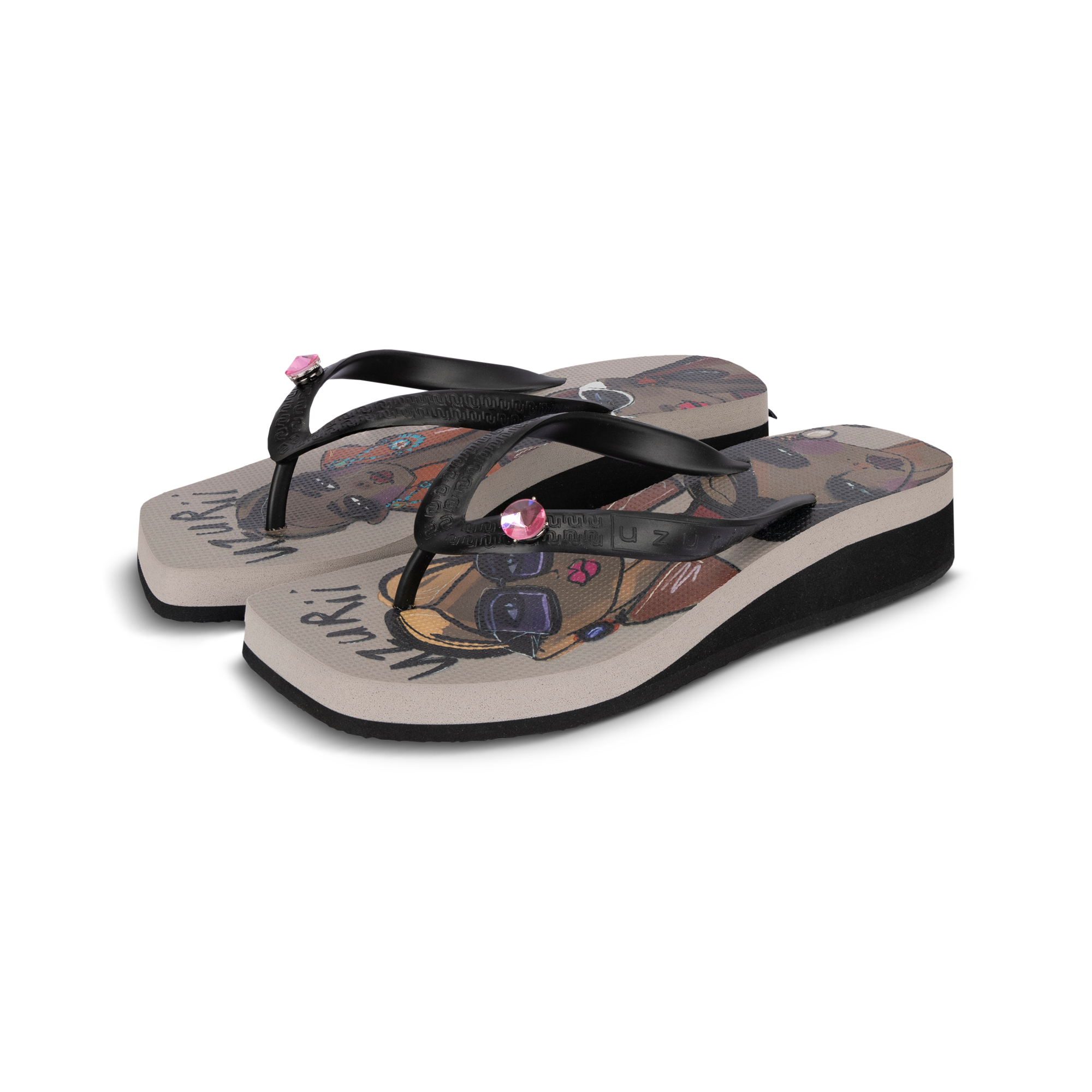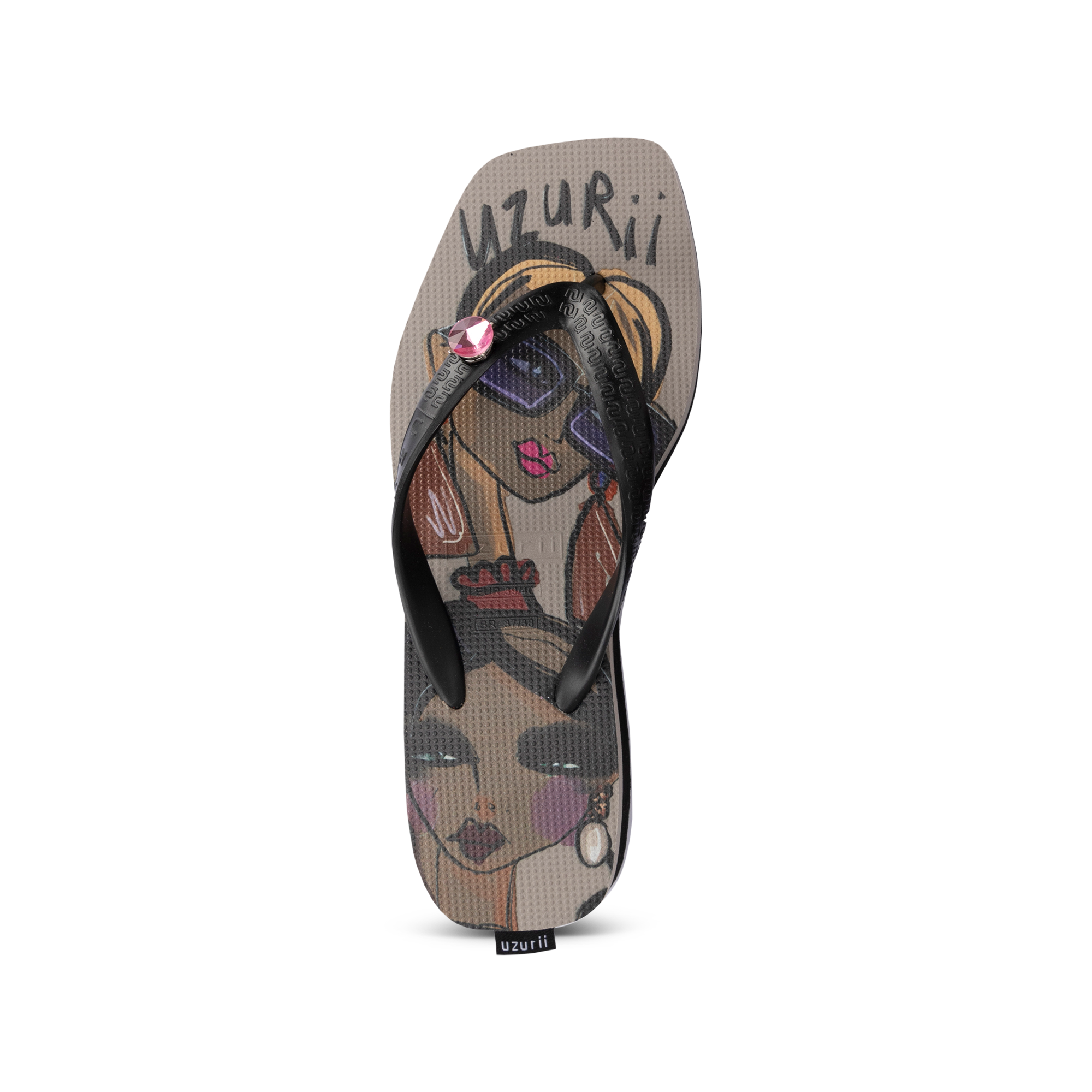 De Beach Printed Stella is niet zoals alle anderen, net als jij! De vierkante plateauzool is versierd met een handgemaakte tekening (optioneel: voor ons ontworpen door Noortje den Oudsten). De print van deze slippers is leuk en speels. De V heeft een effen kleur en een druk knop waarmee je de switch button makkelijk zelf kunt verwisselen. Kies uit een groot aantal stenen uit onze accessoirelijn. Zo tover je jouw paar flip flops eenvoudig om tot een nieuwe look!Onze slippers zijn uniek, handgemaakt en met zorg en liefde ontworpen. De zool, die zijdezacht aanvoelt aan je voet, is gemaakt van rubber. De bandjes zijn gemaakt van PVC. De V kenmerkt zich door het originele Uzurii logo op de bandjes. Onze slippers worden gemaakt in China en BraziliÎ