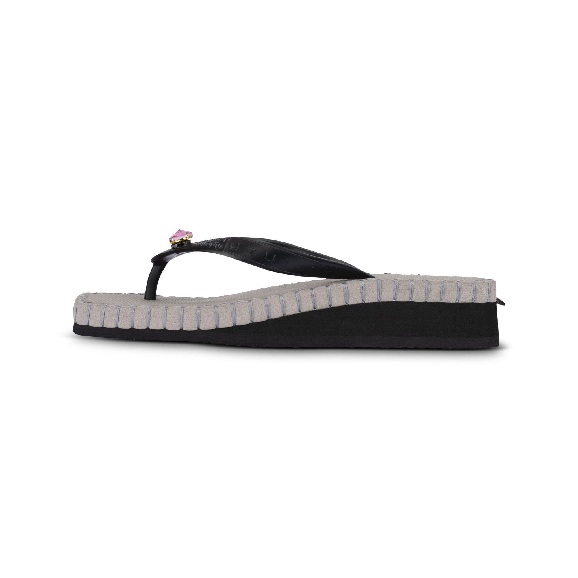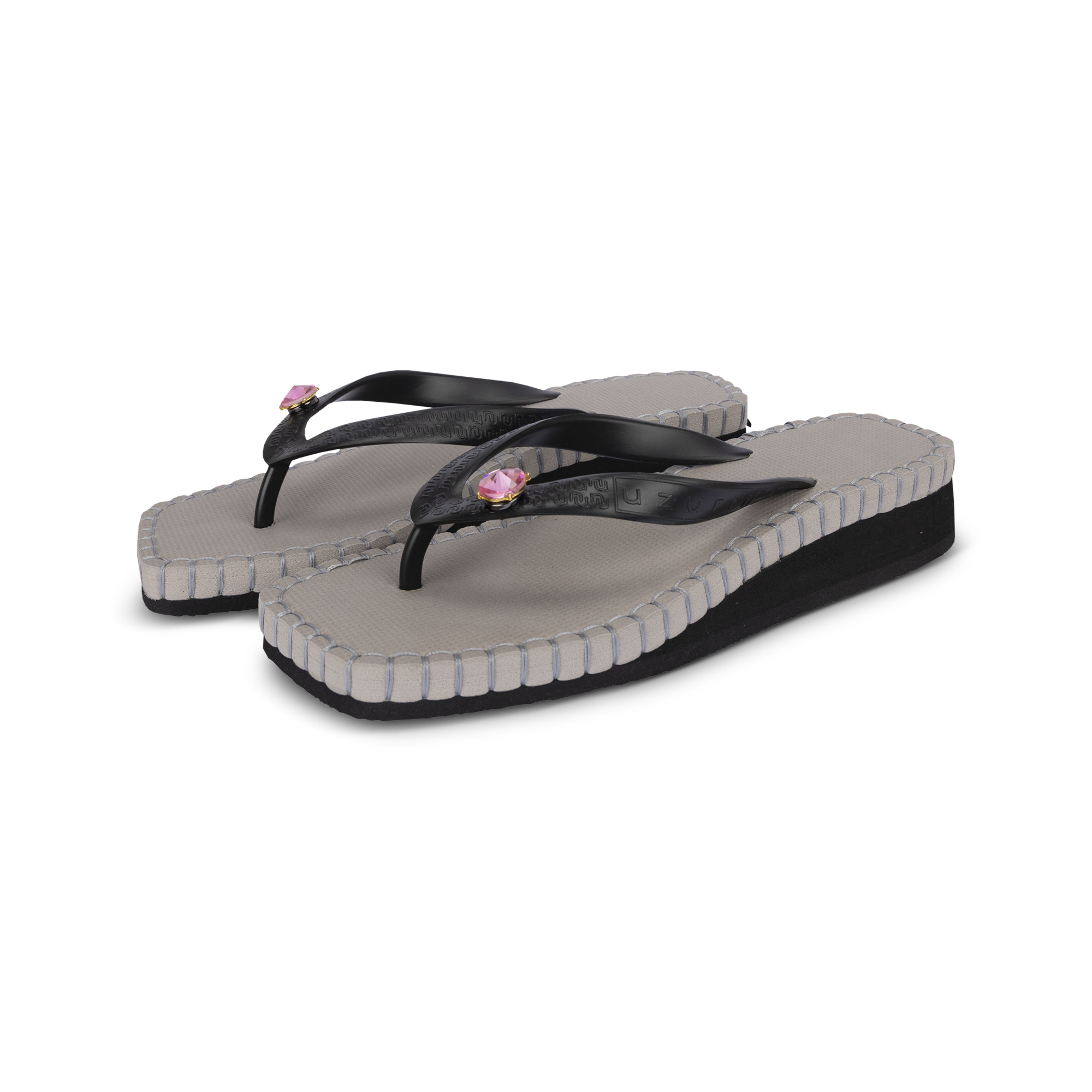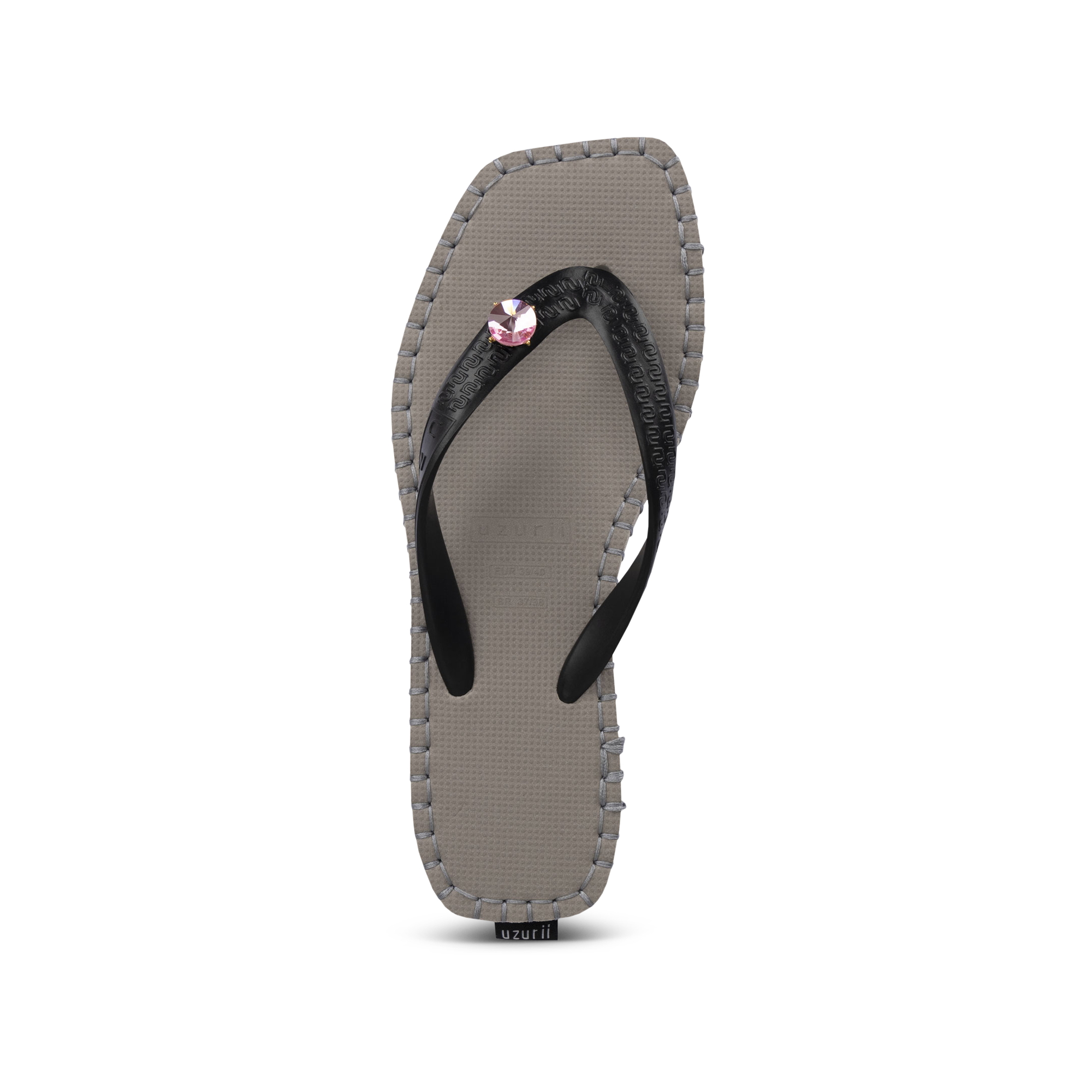 De Stitched by Es Green slipper kenmerkt zich door haar stoere, vierkante zool en stiksels. 'Edgy' en 'sophisticated' beschrijven deze flip flops perfect! De zwarte plateauzool is elegant en makkelijk te combineren. Door de druk knop op de V, kun je de switch button makkelijk zelf verwisselen. Kies uit een groot aantal stenen uit onze accessoirelijn. Zo tover je jouw paar flip flops eenvoudig om tot een nieuwe look!Onze slippers zijn uniek, handgemaakt en met zorg en liefde ontworpen. De zool, die zijdezacht aanvoelt aan je voet, is gemaakt van rubber. De bandjes zijn gemaakt van PVC. De V kenmerkt zich door het originele Uzurii logo op de bandjes. Onze slippers worden gemaakt in China en BraziliÎ.